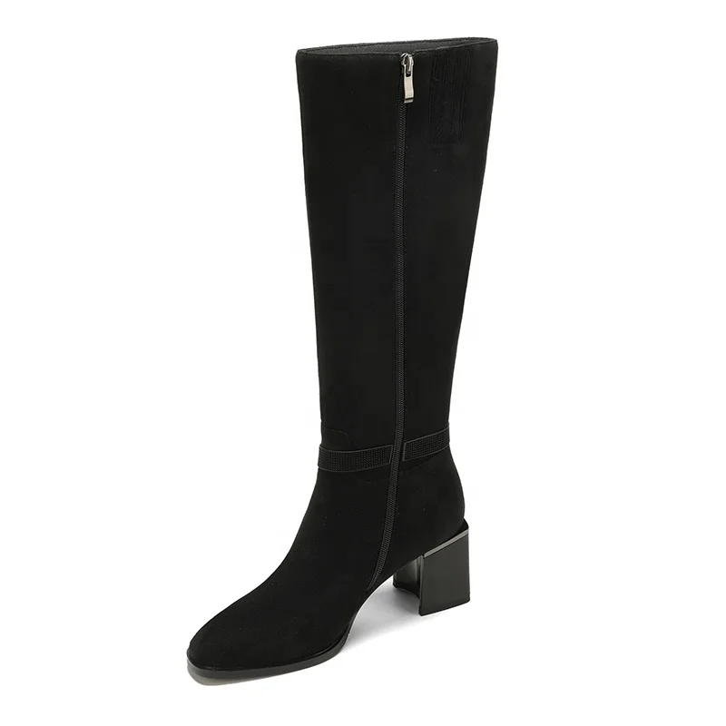 Moncheer Women's Black Suede Knee-High Boots with Strap Detail & Mid Block Heel