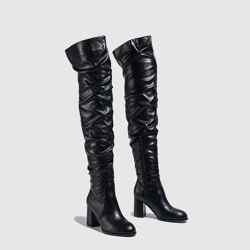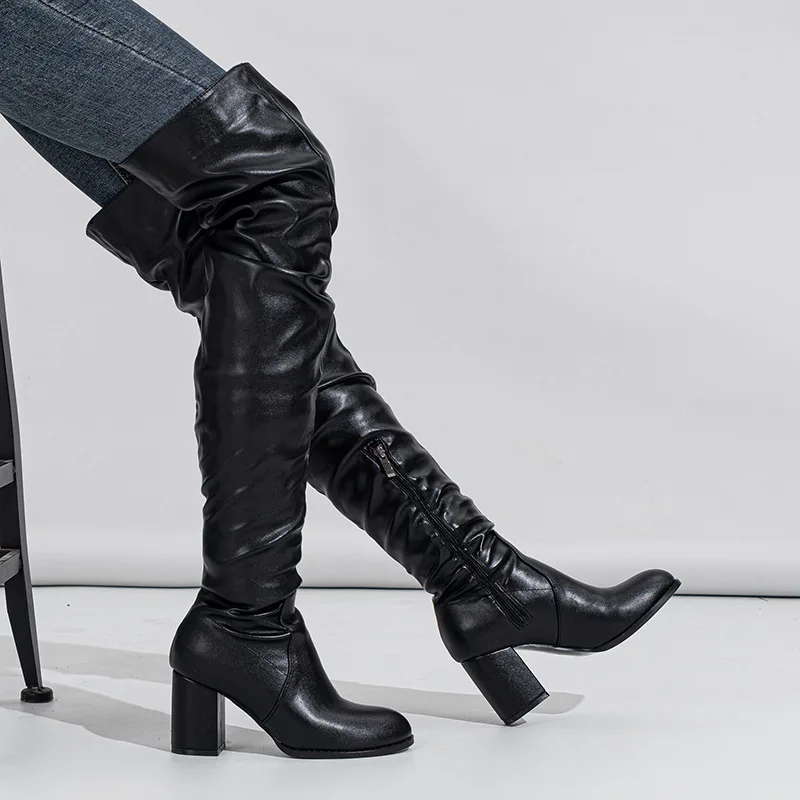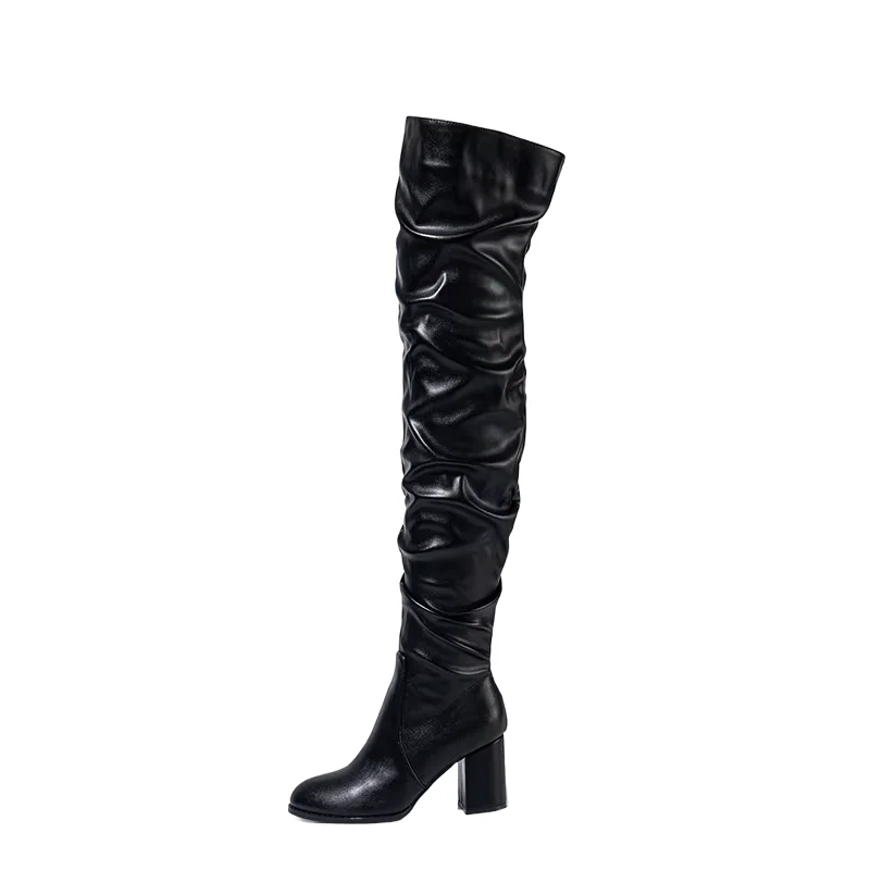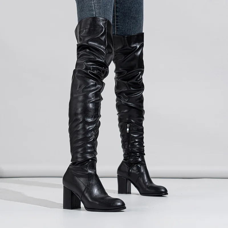 Women's Winter Over-the-Knee Boots with Ruched Design and Chunky Heel Black Faux Leather Height Increasing Feature