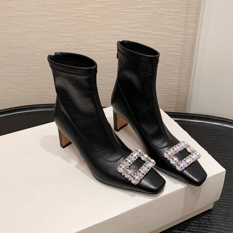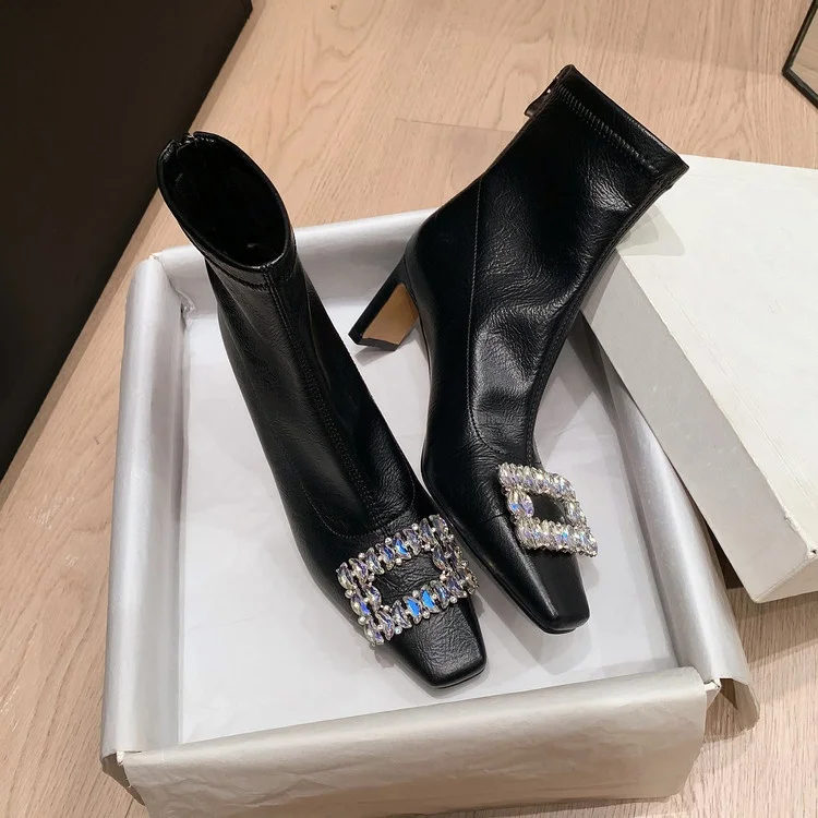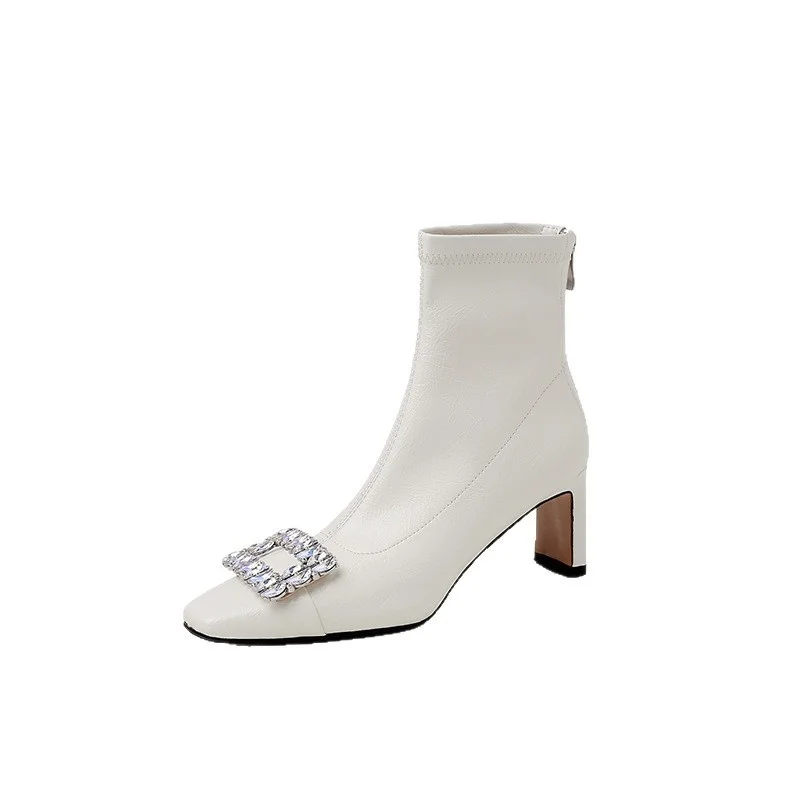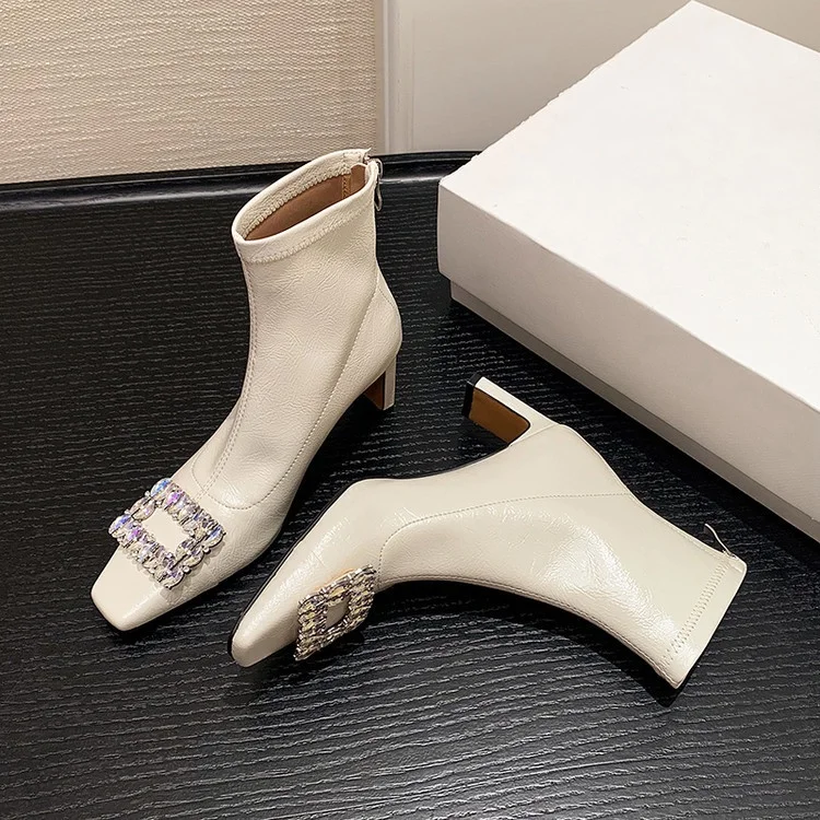 Women's White Ankle Boots with Sparkling Rhinestone Square Buckle Square Toe Block Heel Stylish Footwear for Wholesale