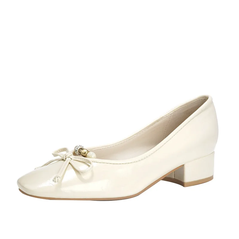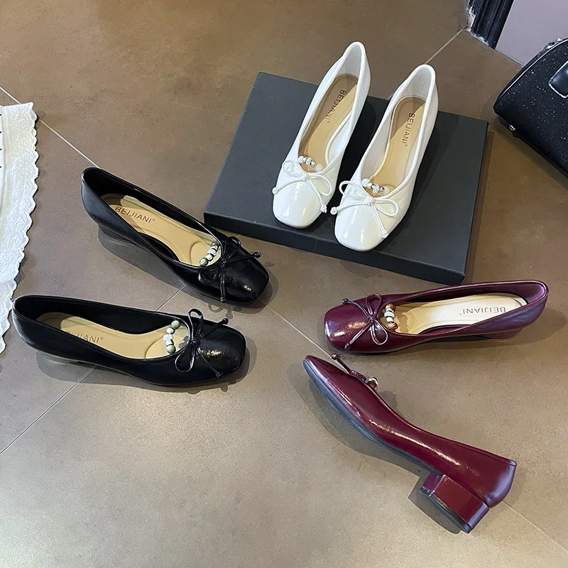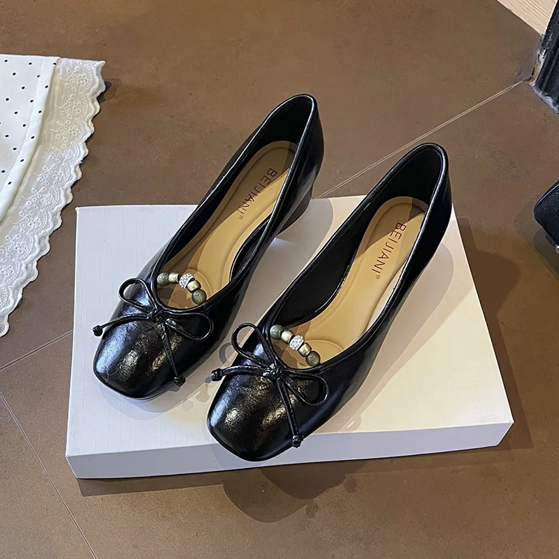 OEM/ODMTextured Bow Beads Slip-On Mary Jane Shoes Women's Thick Heel Square Toe Comfortable Spring Autumn