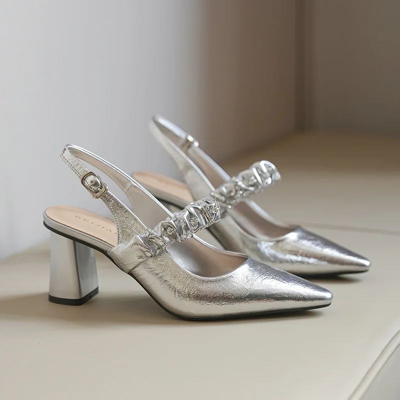 OEM/ODMFrench Temperament One-character Pointed High-heeled Buckle Strap Thin Heeled 6-8cm Women's Baotou Sandals Silver