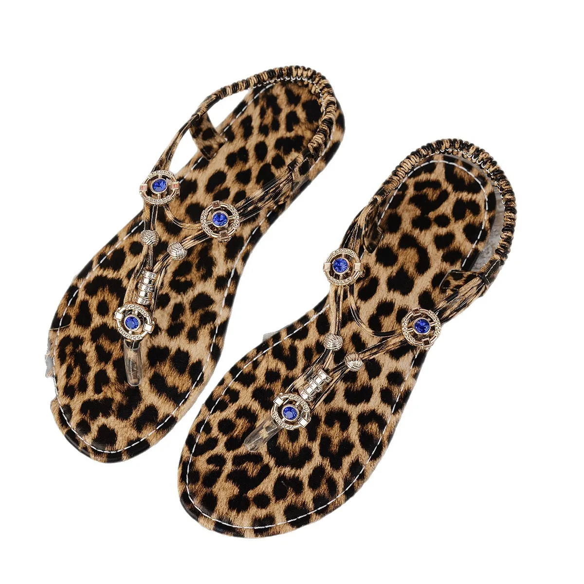 QuiteS 2026 New Plus Size Summer Round Toe Flat Bohemian Style Beaded Heels Leopard Print Sandals Casual Elegant Shoes for Women