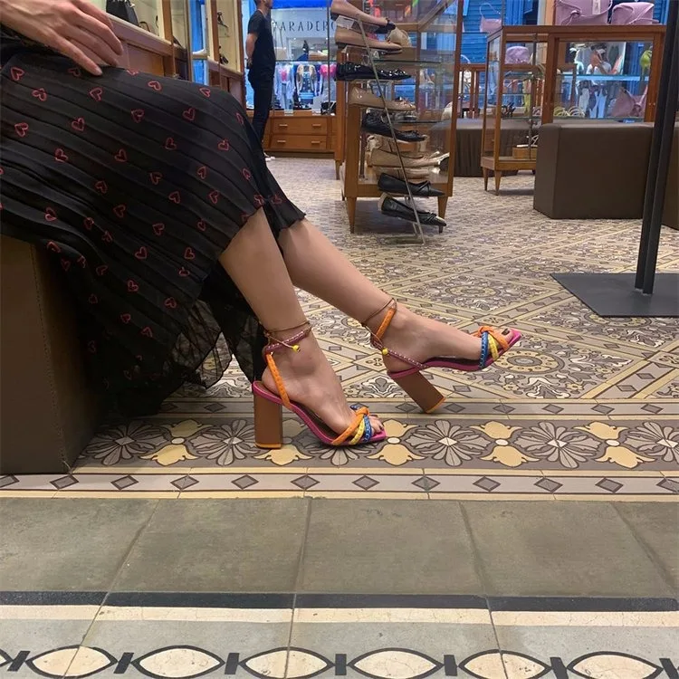 QuiteS Open Toe Colorful Sandals for Plus Size Women Roman Style High Heels Hollow Square Heels Slip-On Fashion Trend for Summer