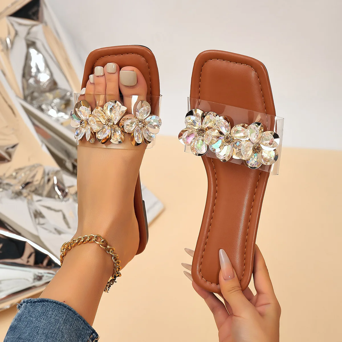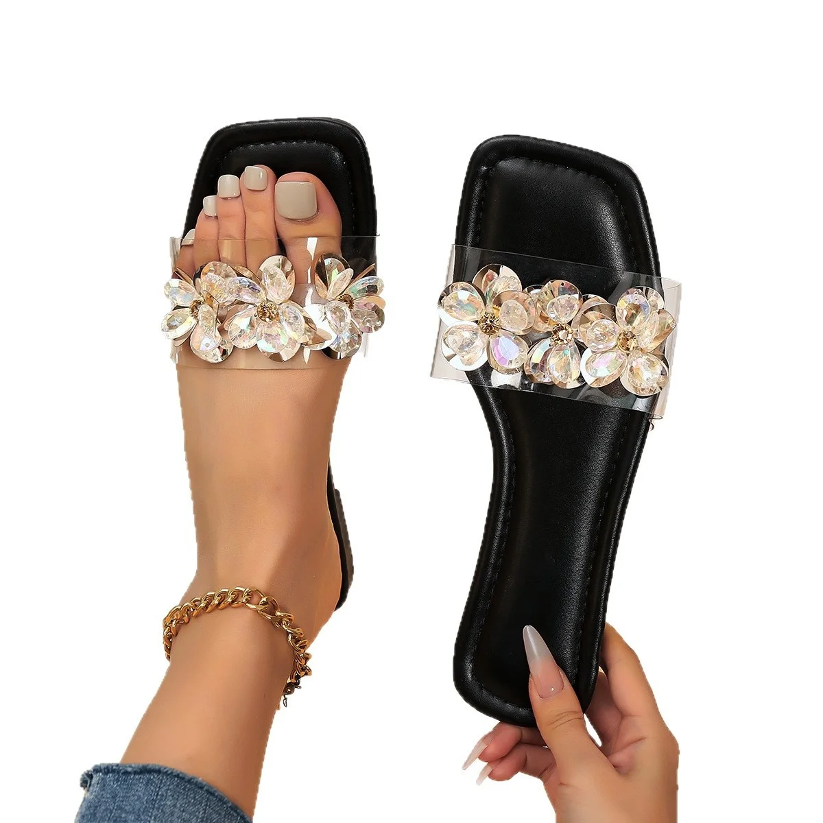 2026 QuiteS New Korean Style Square-Toe Slip-On Sandals Medium Thick-Soled Casual Slides Transparent Strap Flat Fashion Trend