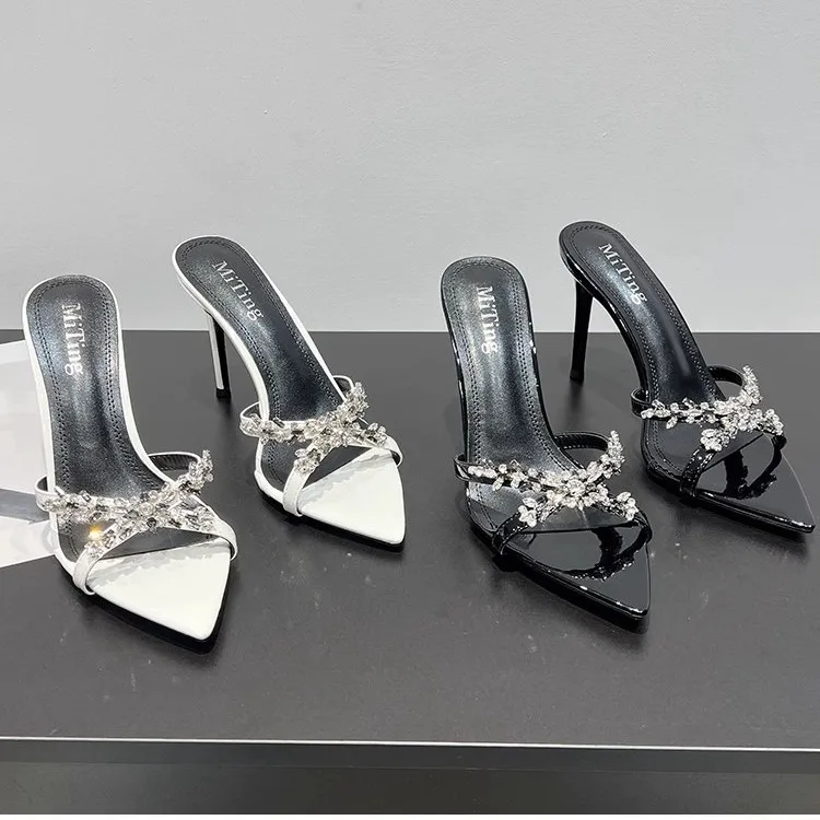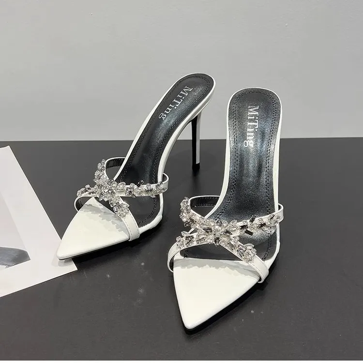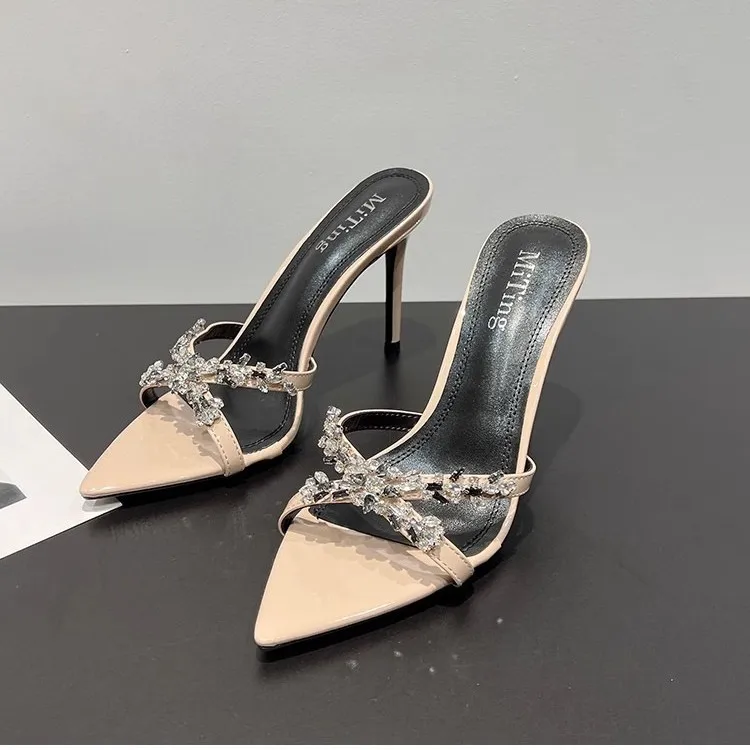 QuiteS 2026 Ladies Summer High Heels Rhinestone Decorated Sandals Water-Sensitive Pointed Toe Shoes Slip-On Closure New Style
