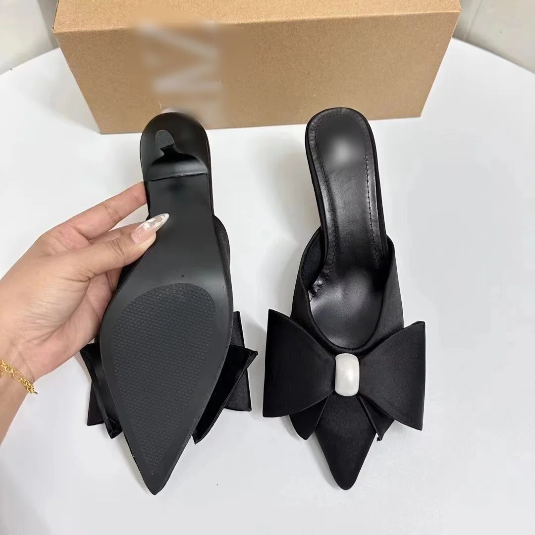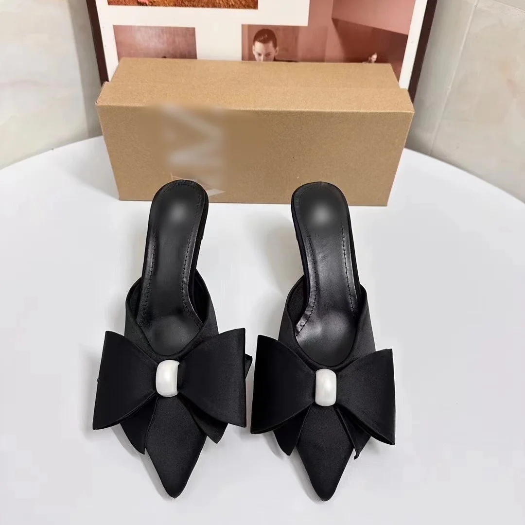 QuiteS New Women's Shoes Pearl Decorative Black Big Bow After Empty Pointed High Heels for Women Za Designer Heels Sandals