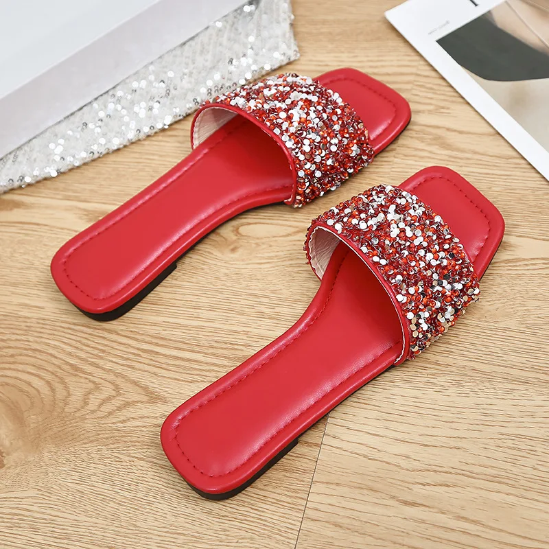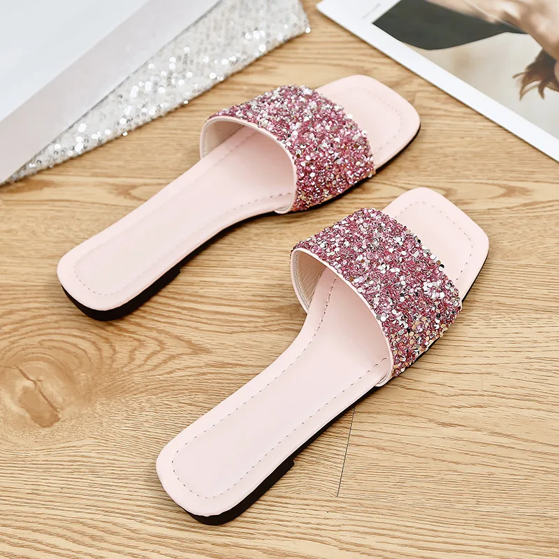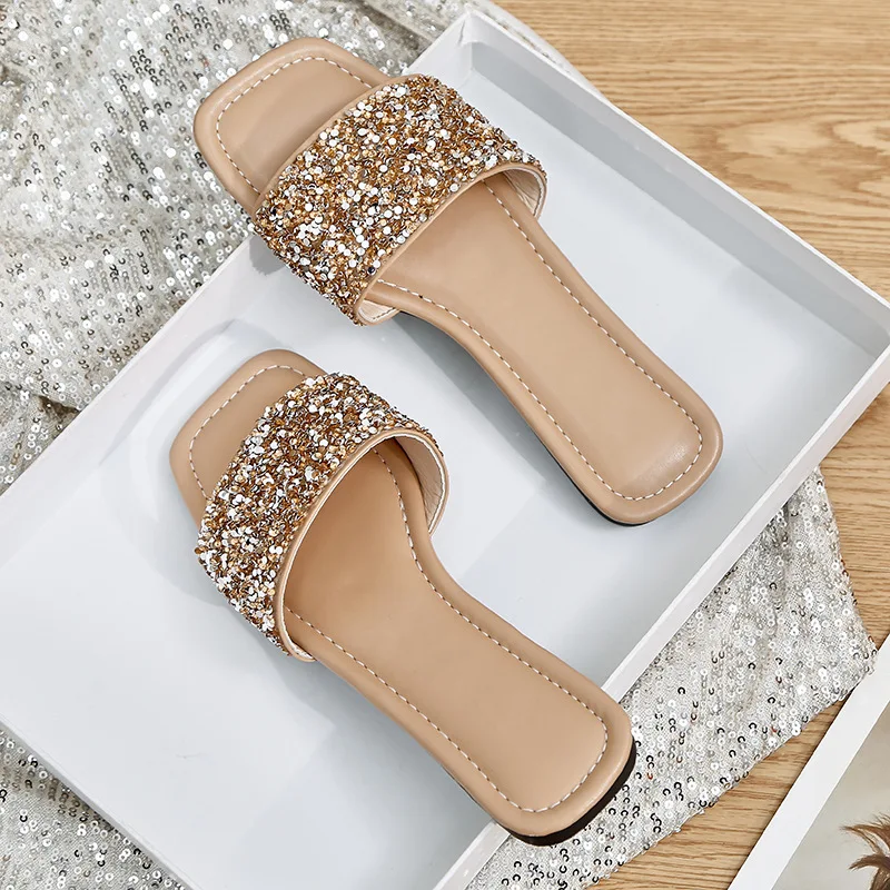 QuiteS 2026 Single Luxury Beach Shoe for Women Elegant Rhinestone Sequin Flat Casual Slide One-Word Trendy for Summer
