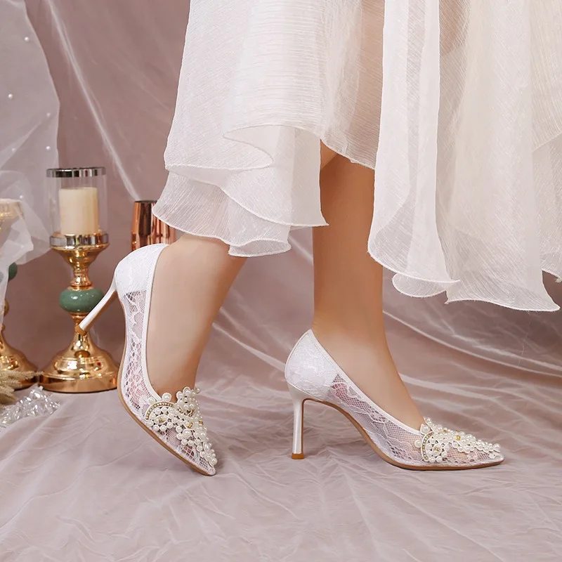 QuiteS 2026 Women's Sexy Club Shoes French Romantic Wedding Sandals Thin Heel Mesh Tulle Pearls Slip-On Anti-Slip Design for