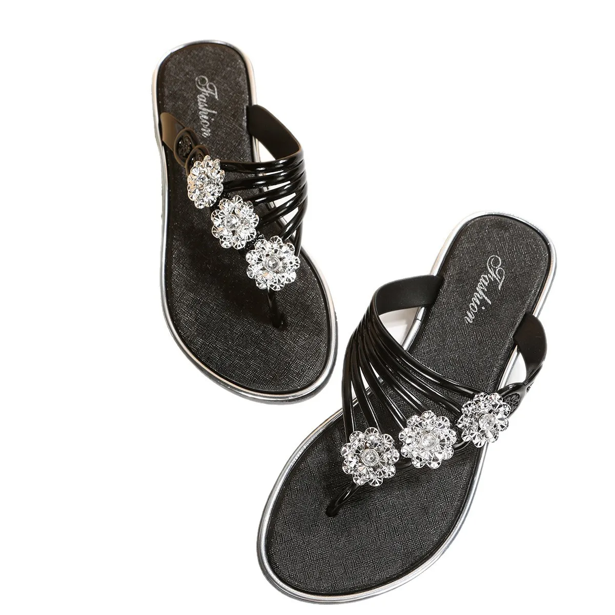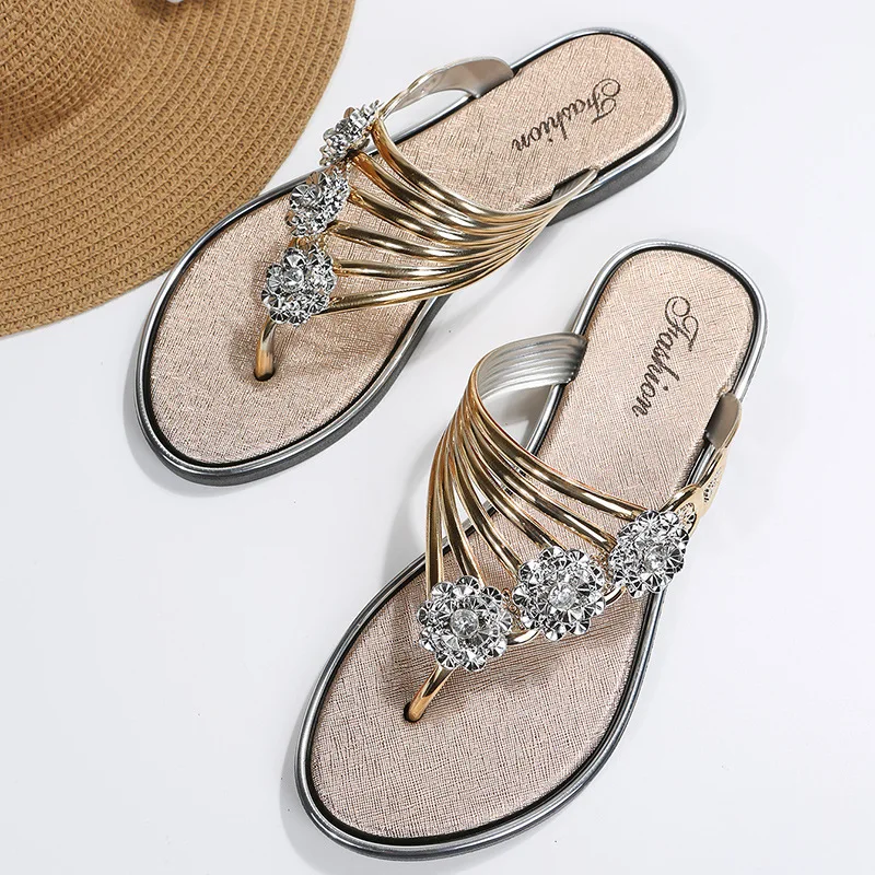QuiteS 2026 New Summer Plus Size 36-45 Casual Sandals Diamond Decoration Platform Flip-Flops Flat Elegant Beach Shoe for Women