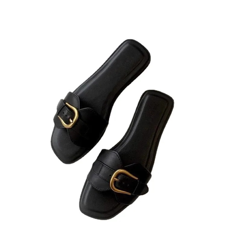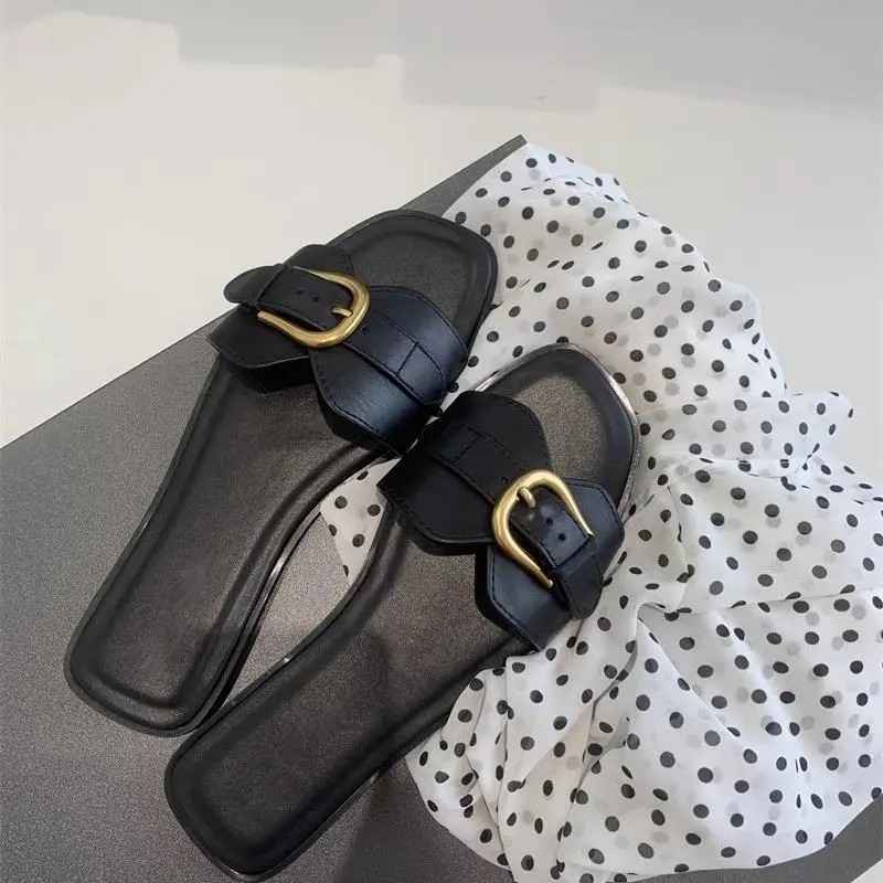 2026 New Summer Outdoor Flat Fashion Slides Women's Square Toe Soft Sole One-Word Flip-Flops Metal Belt Buckle for Slippers