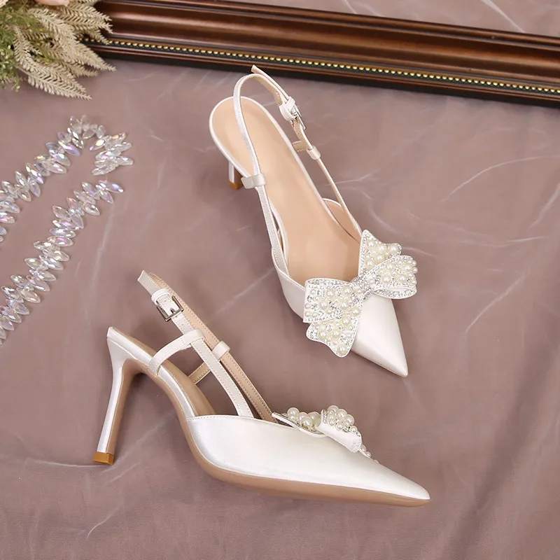 QuiteS 2026 French Romantic Wedding Slippers for Women Slim Thin Heel Bow Pearl PU Insole for Summer and Autumn