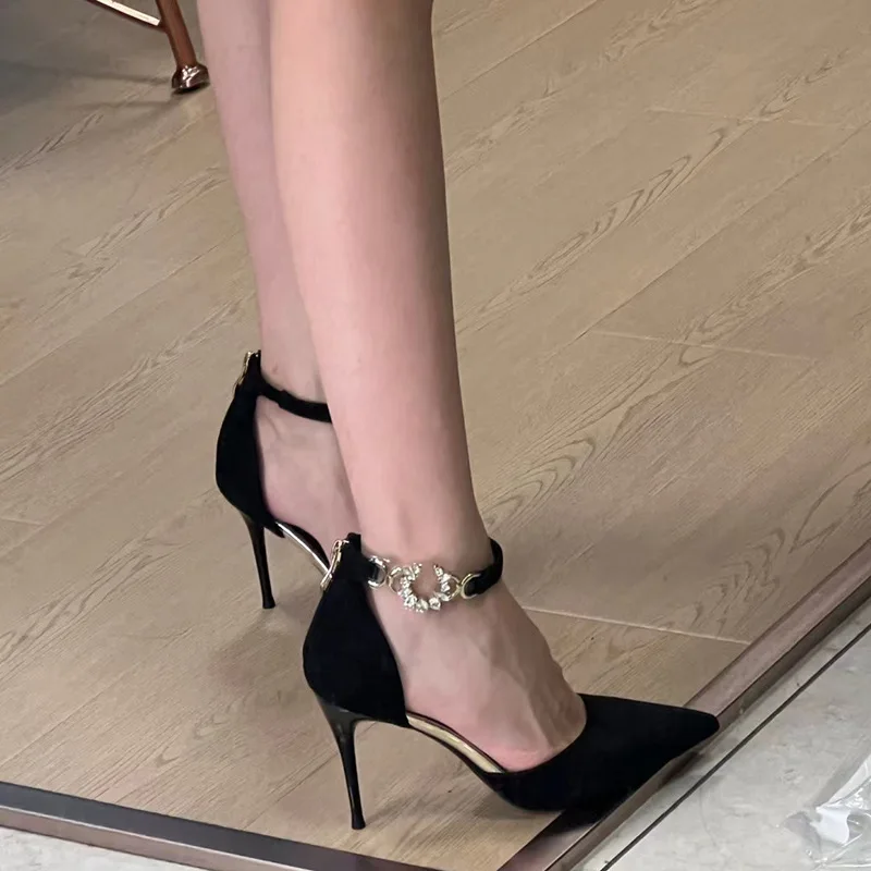 QuiteS 2026 New Black Velvet Pointed Toe Stiletto Heels Sandals ZIP One-Strap Rhinestone Hollow Shoes for Women