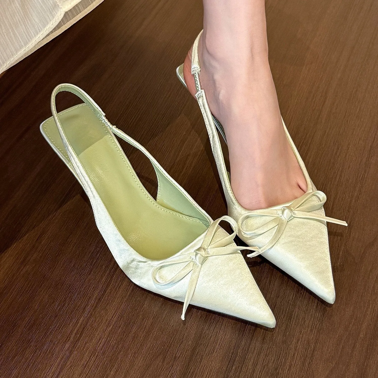 QuiteS Women's Trendy Simple Stiletto High Heels Satin Pointy Bow Ladies' Summer French Sandals with Shallow Mouth Empty