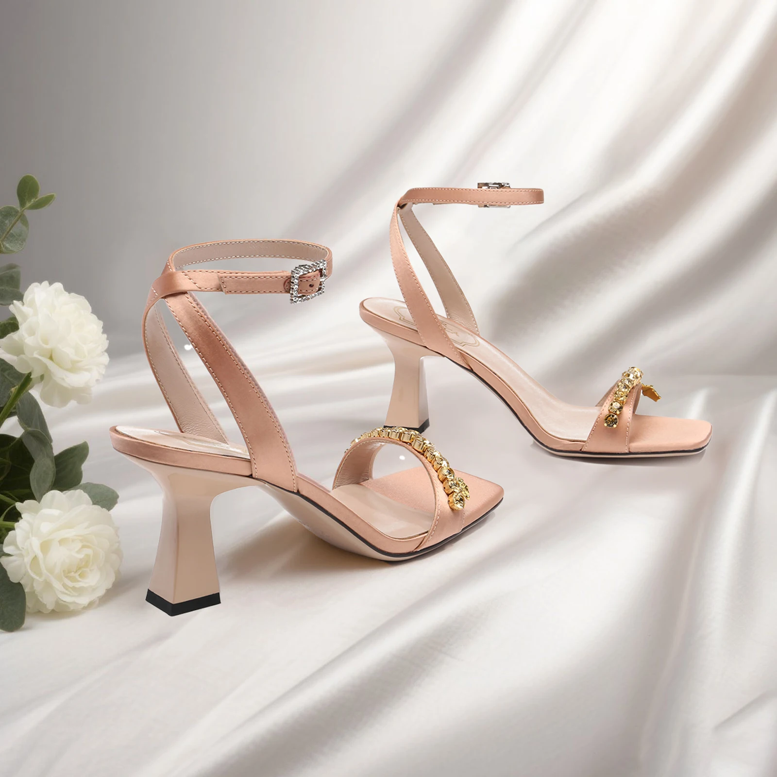 Women Elegant T-strap Chunky Heels Pumps Crystal Rhinestone SQUARE Toe Summer Luxury Ankle Wrapped Sandals for Wedding