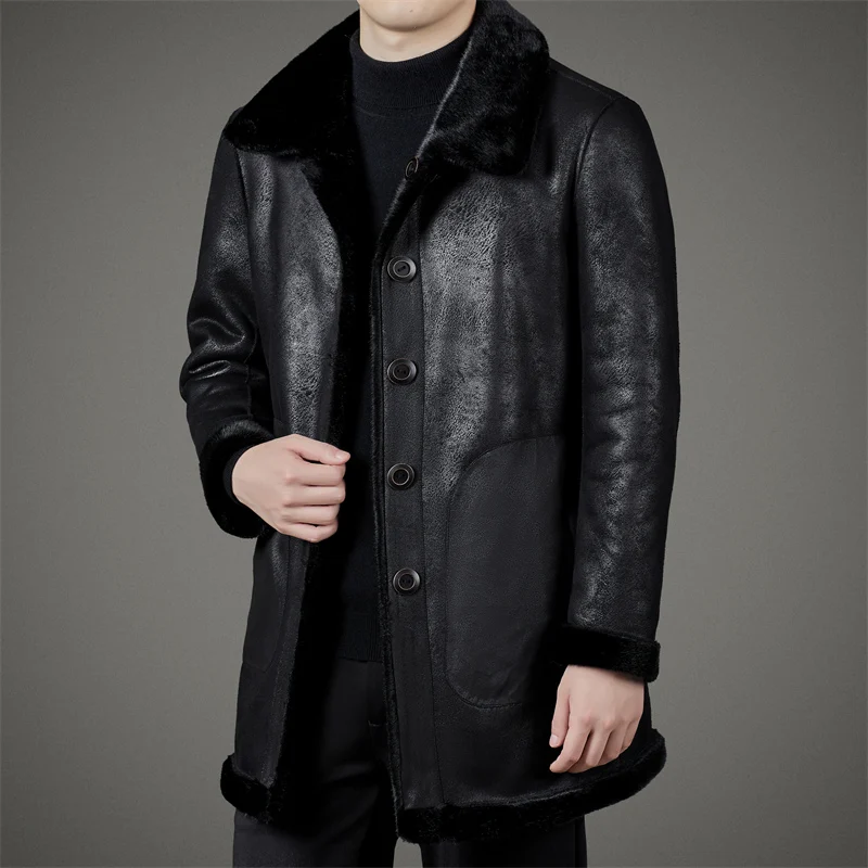Winter 2022 New Men's Wool Embroidered Flight Jacket Black Sheepskin Shearling Leather Jacket