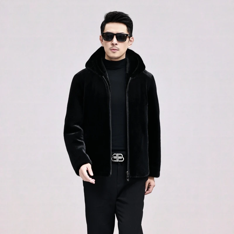 Men's Winter Fur Coat with Black Artificial Mink Lining, Hooded, Warm and Protective, Fashionable Jacket