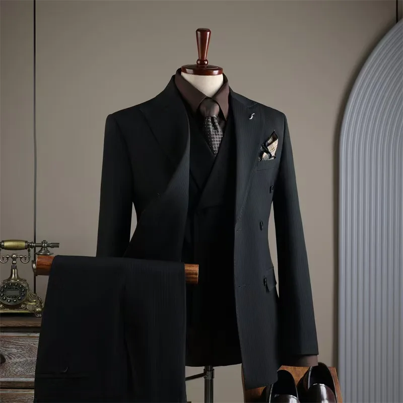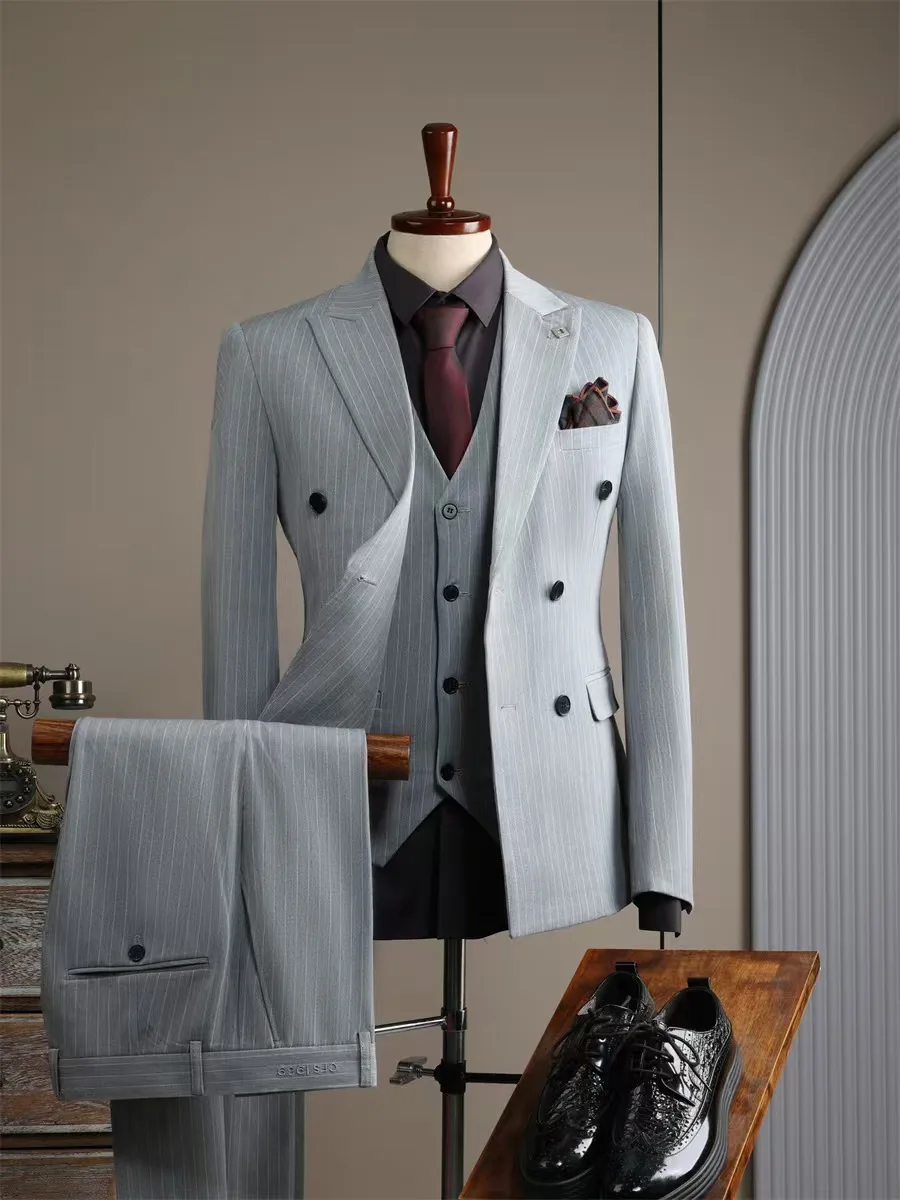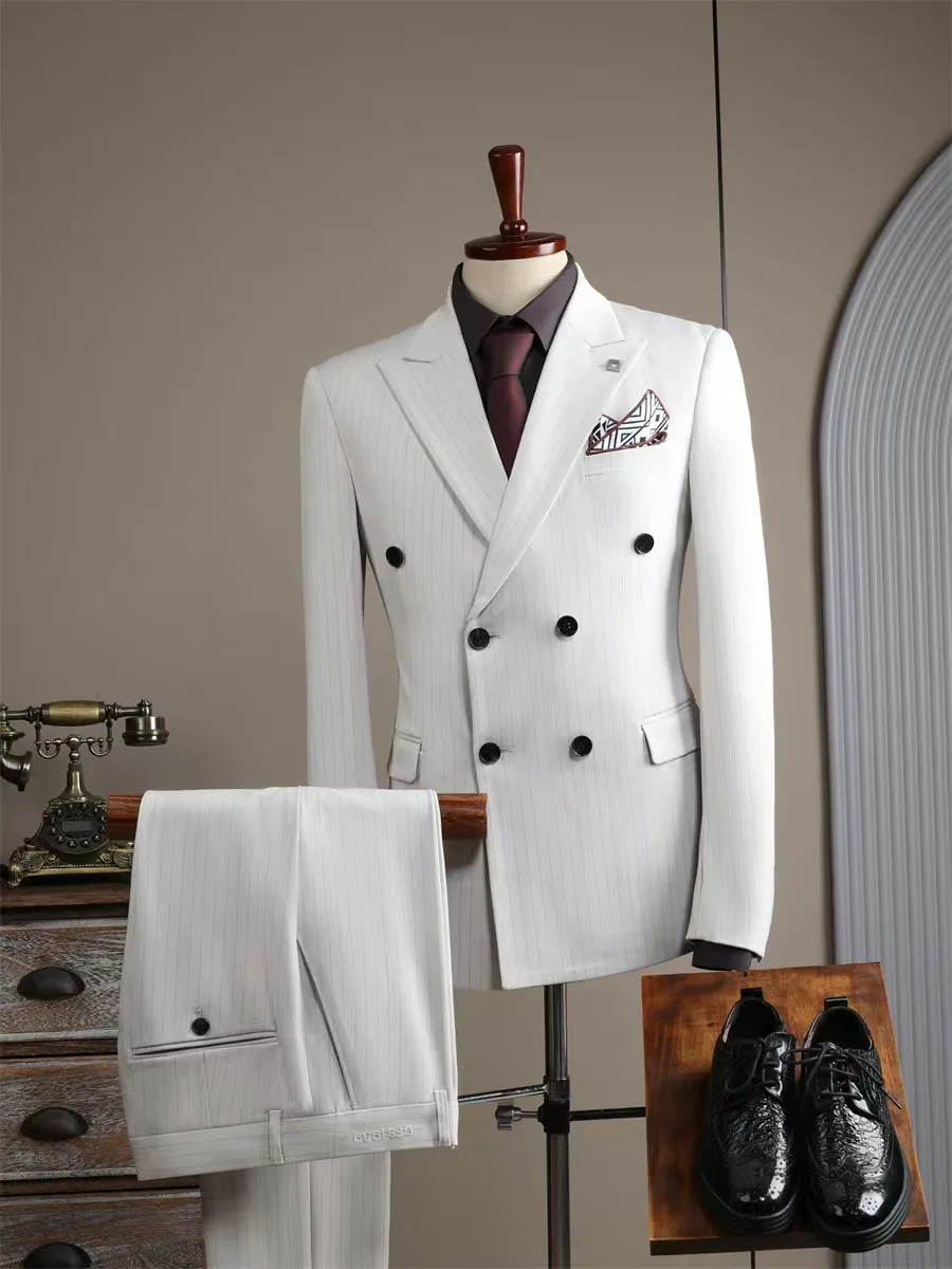 Trendy Double-button Striped Italian/British Style Plus Size Suit Men Casual Wedding Attire Groom's Outfit Formal Slimming