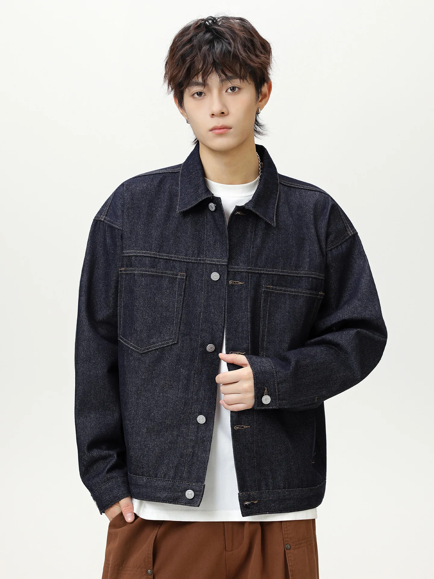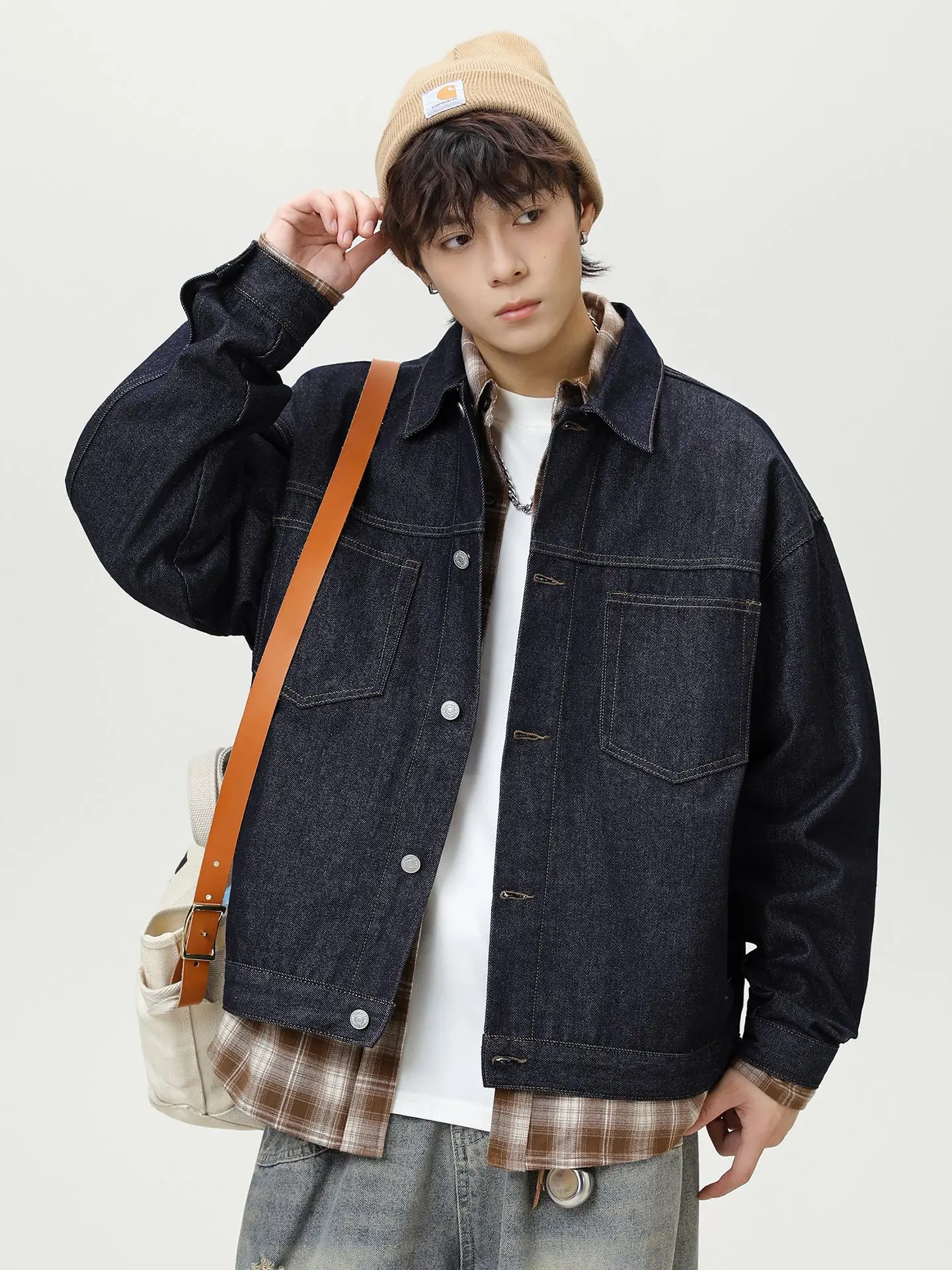 Ming Line Original Men's Vintage Cow Double Pocket Tooling Denim Jacket Breathable 100% Cotton Light Wash Autumn American Retro