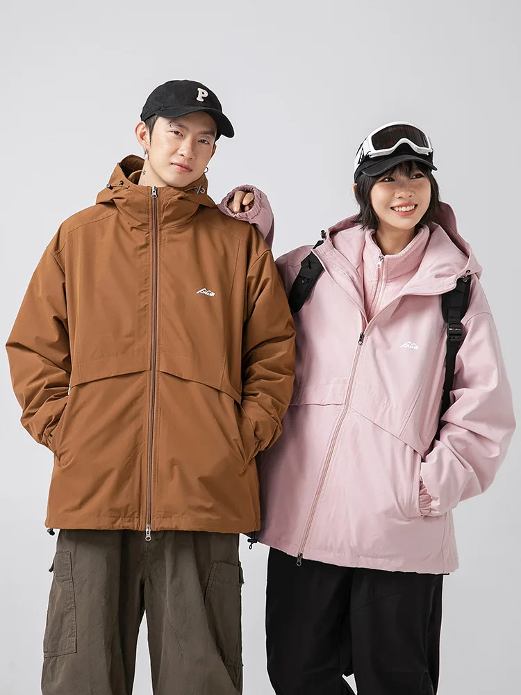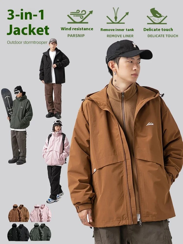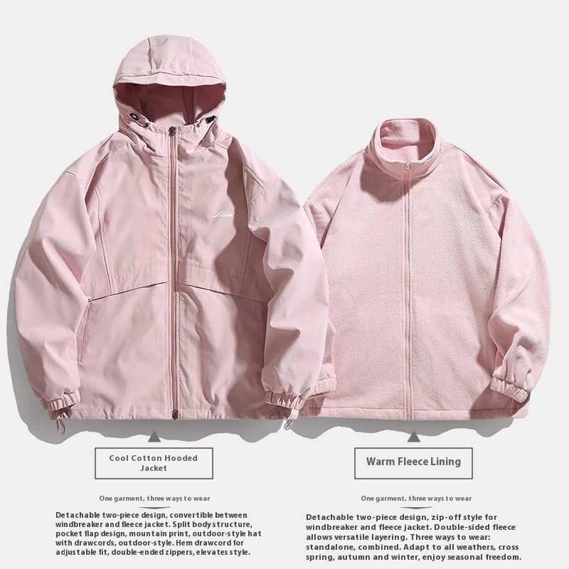 Three-in-One Charging Hooded Jacket Men Women Winter Japanese Loose Detachable Liner Rabbit Stand Front Zipper Hip Hop Windproof