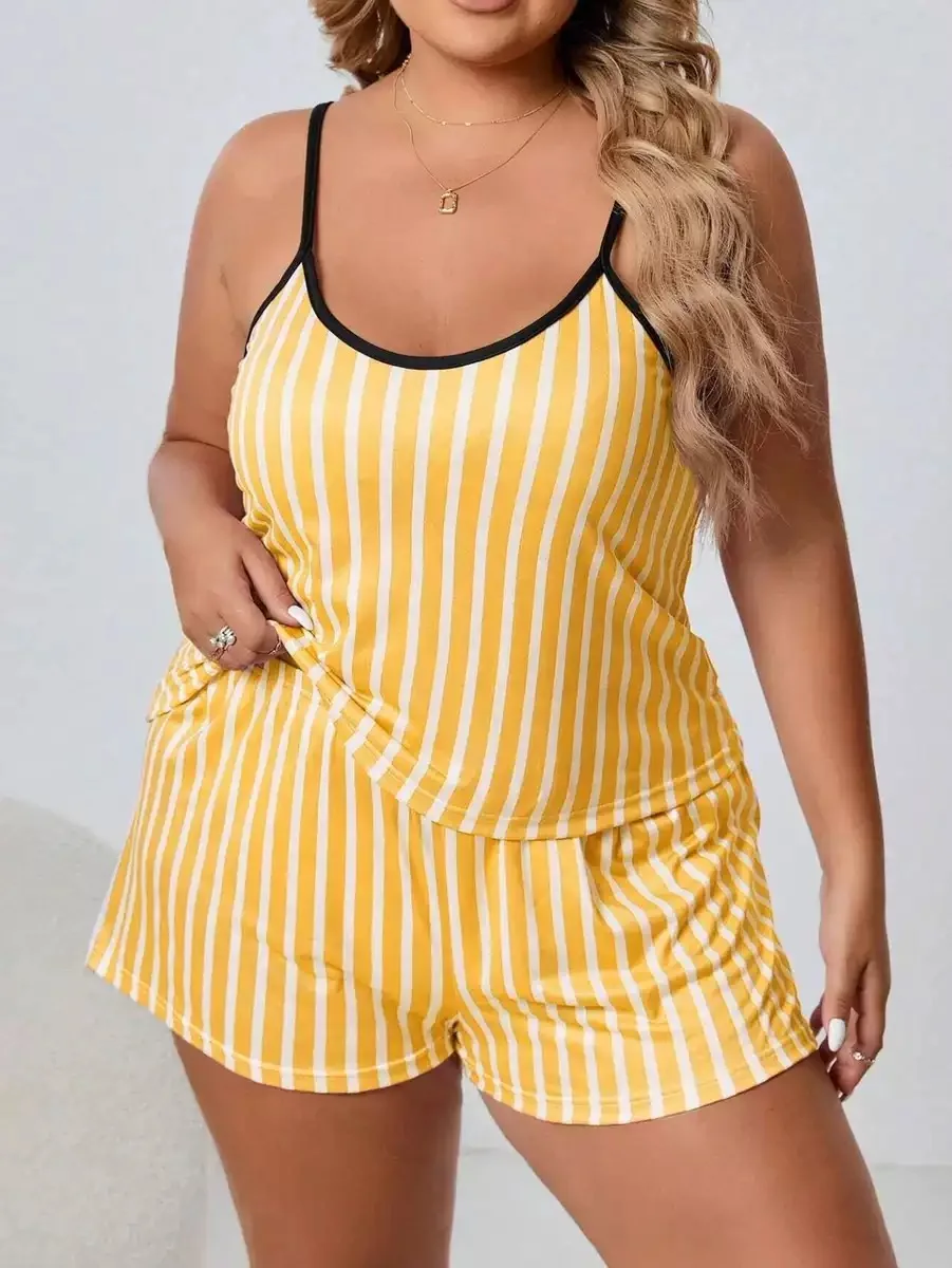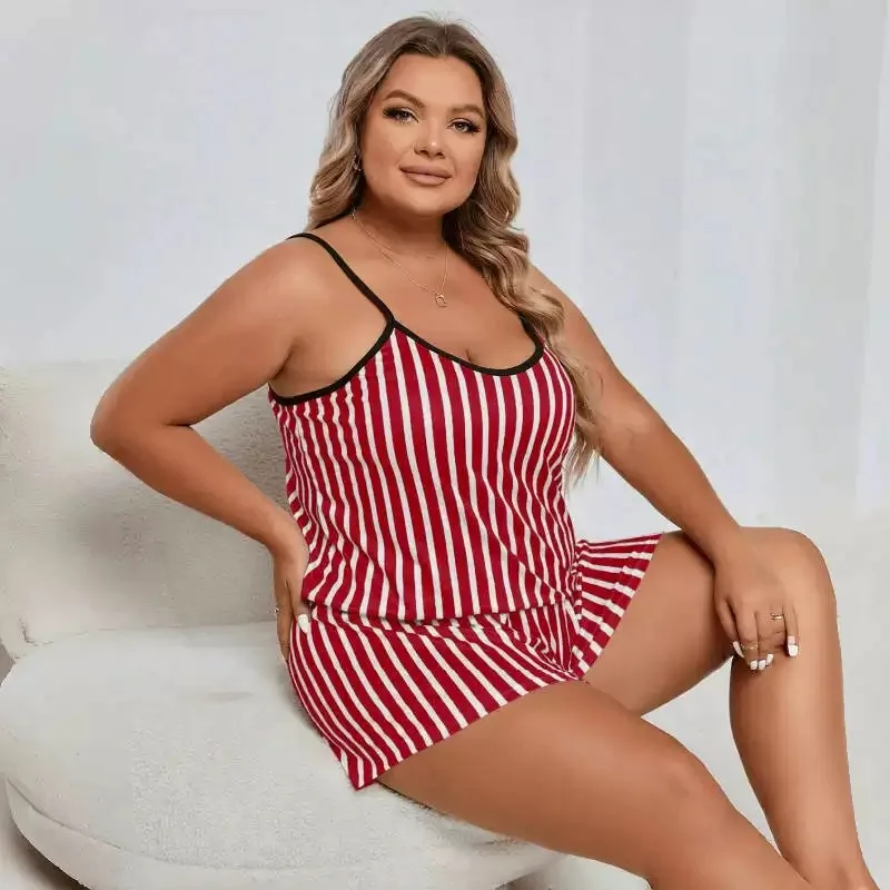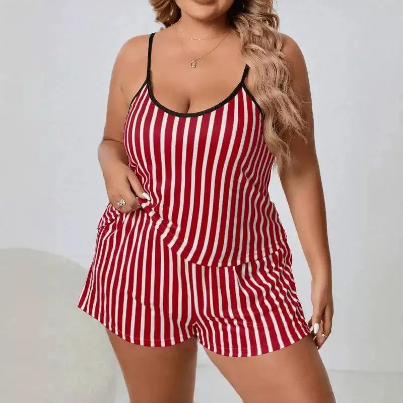 Best Selling Two-piece Set Satin Nightgown Sleeveless Pajamas Elastic Waist Straps Stripe Plus Size Soft Women for Summer
