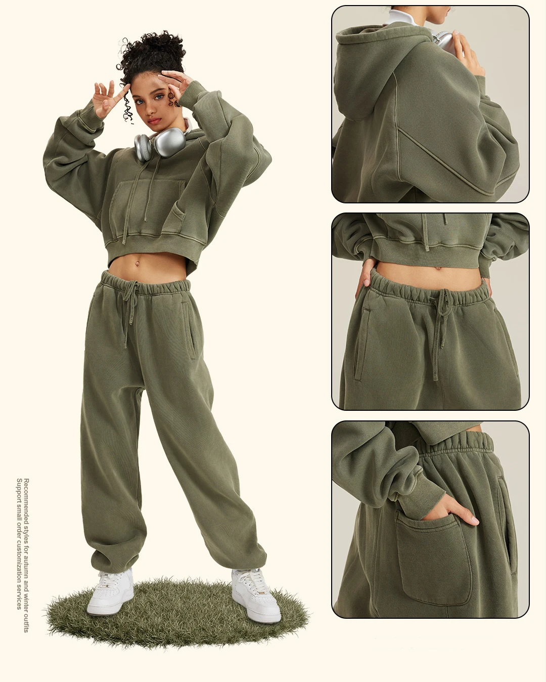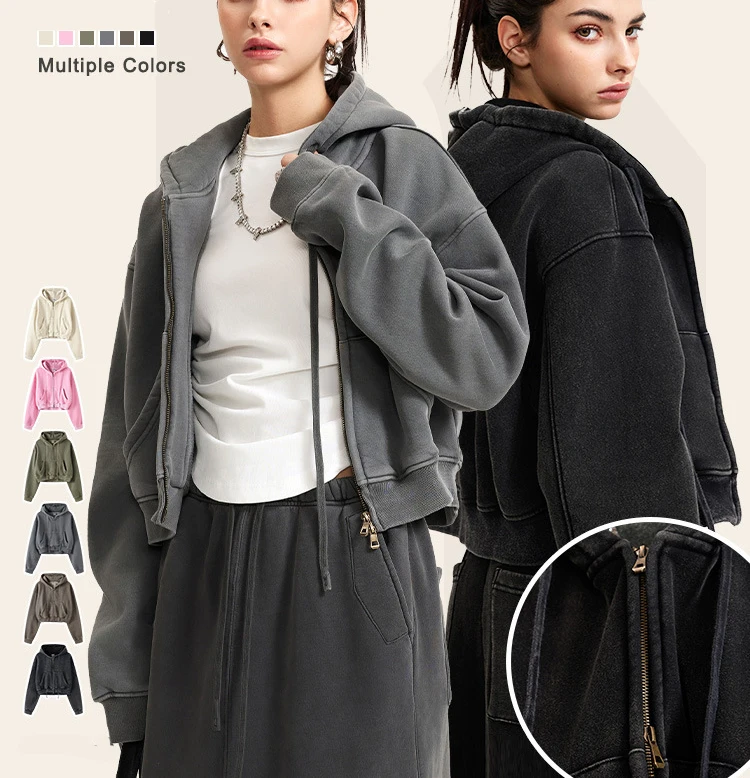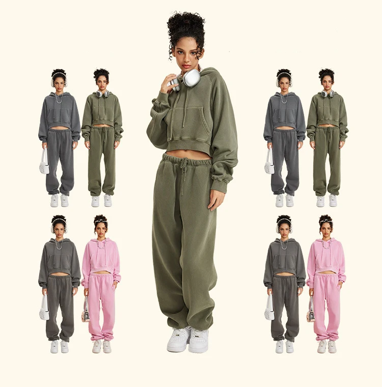 Women Winter Full Length Retro Hoodie High Waist Jogger Pants Set Washed Sweatshirt Vintage Fleece Breathable Sports Tracksuit