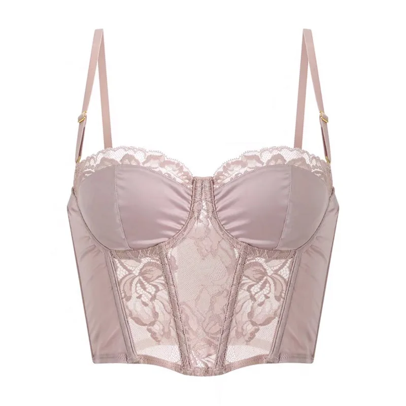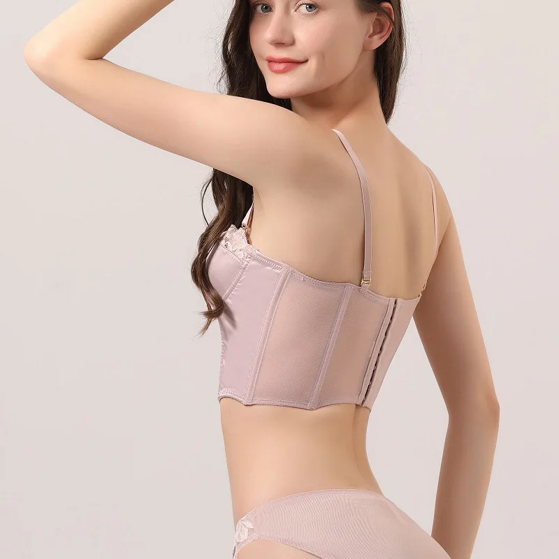 French Style Glossy Intimates Long Wire-Free Bra Sexy Vest Fishbone Design with Small Breasts Body Shaping Lace Bra for Women