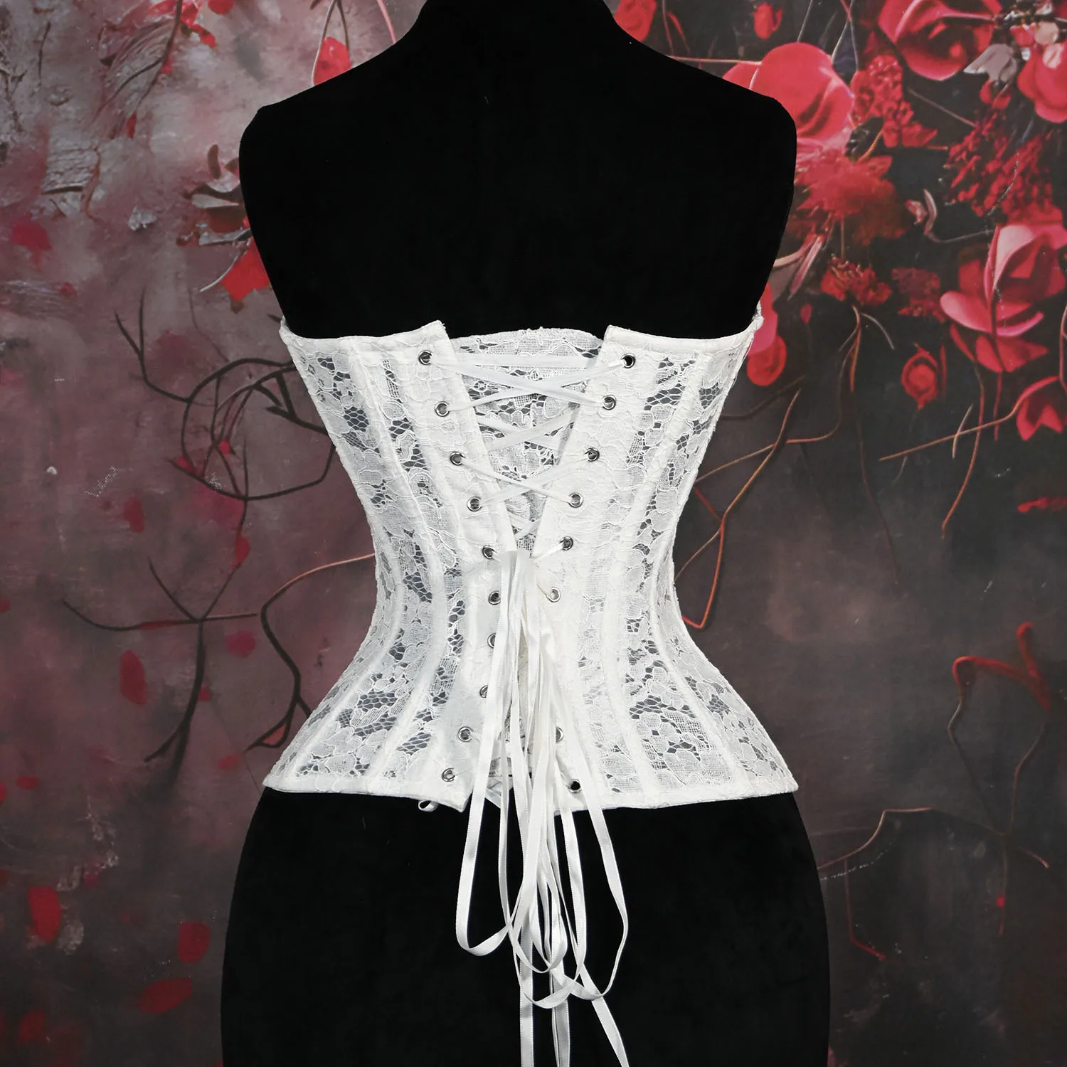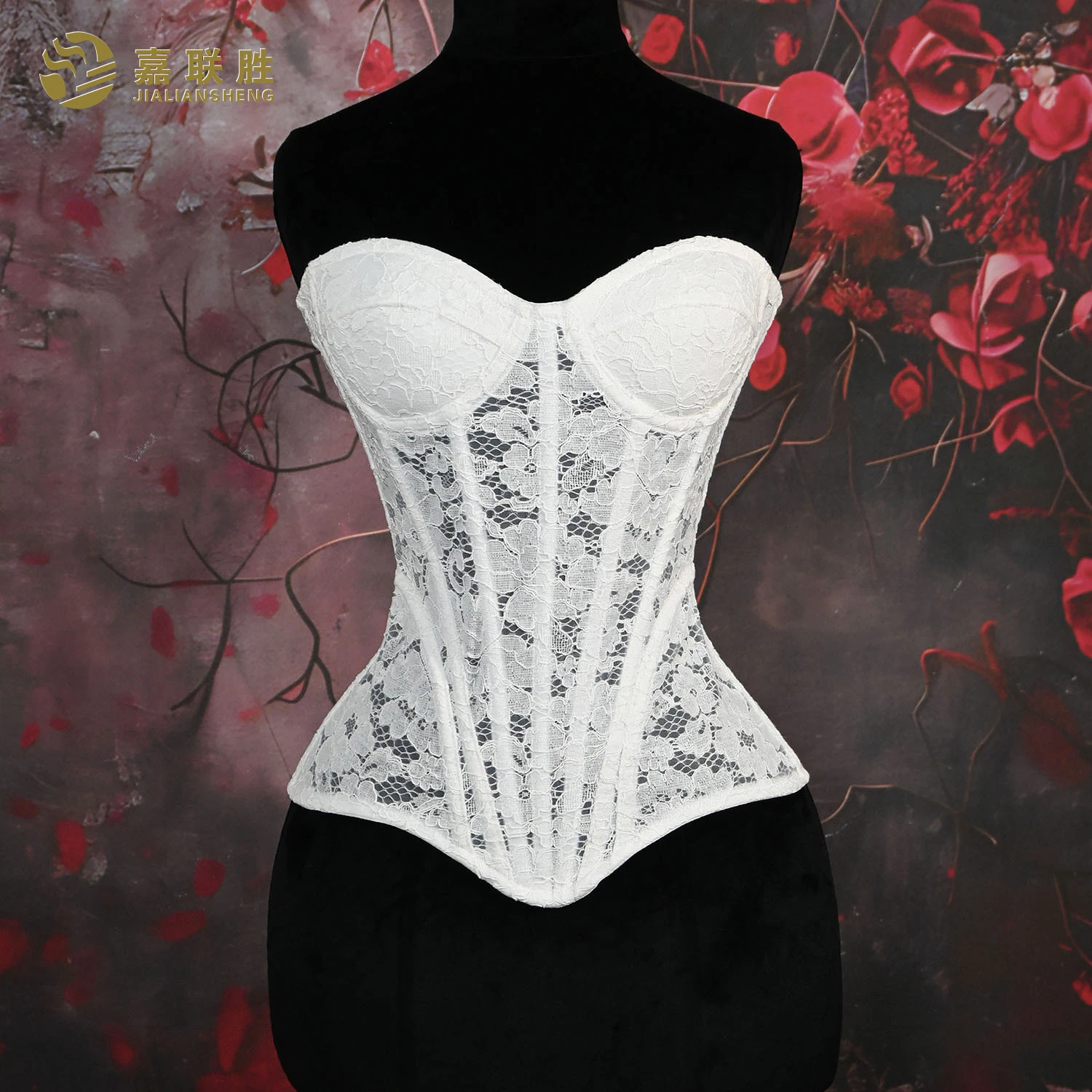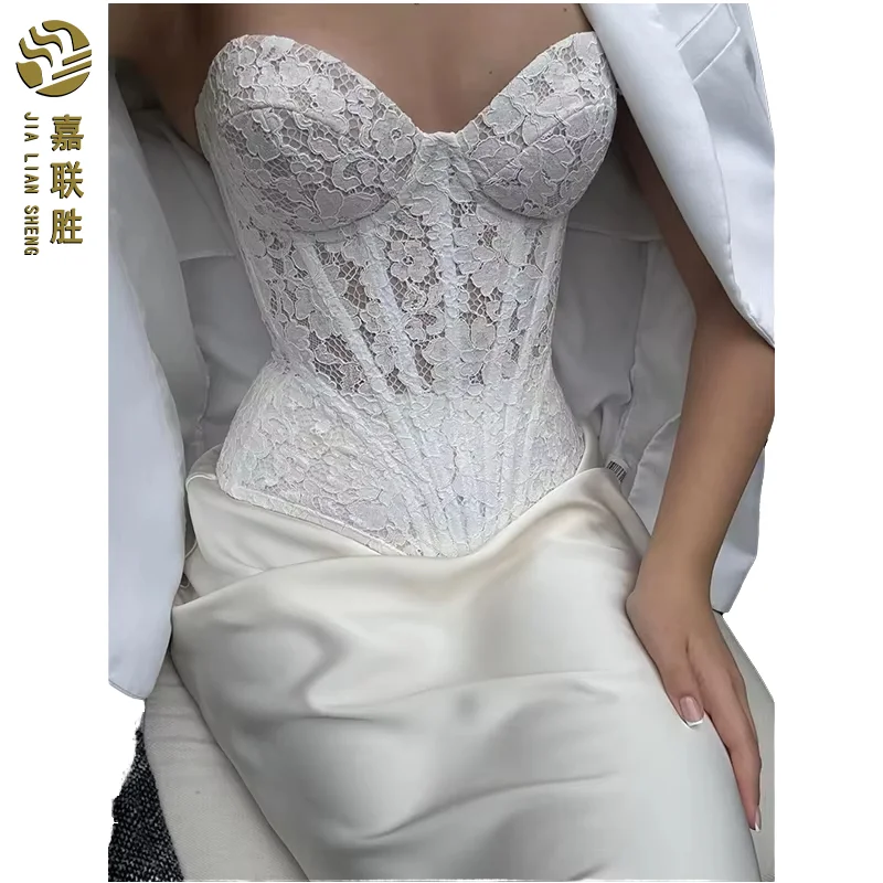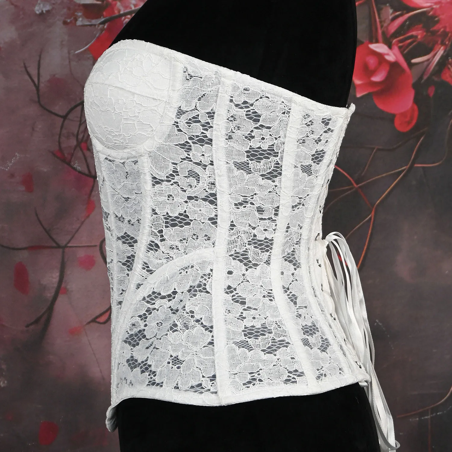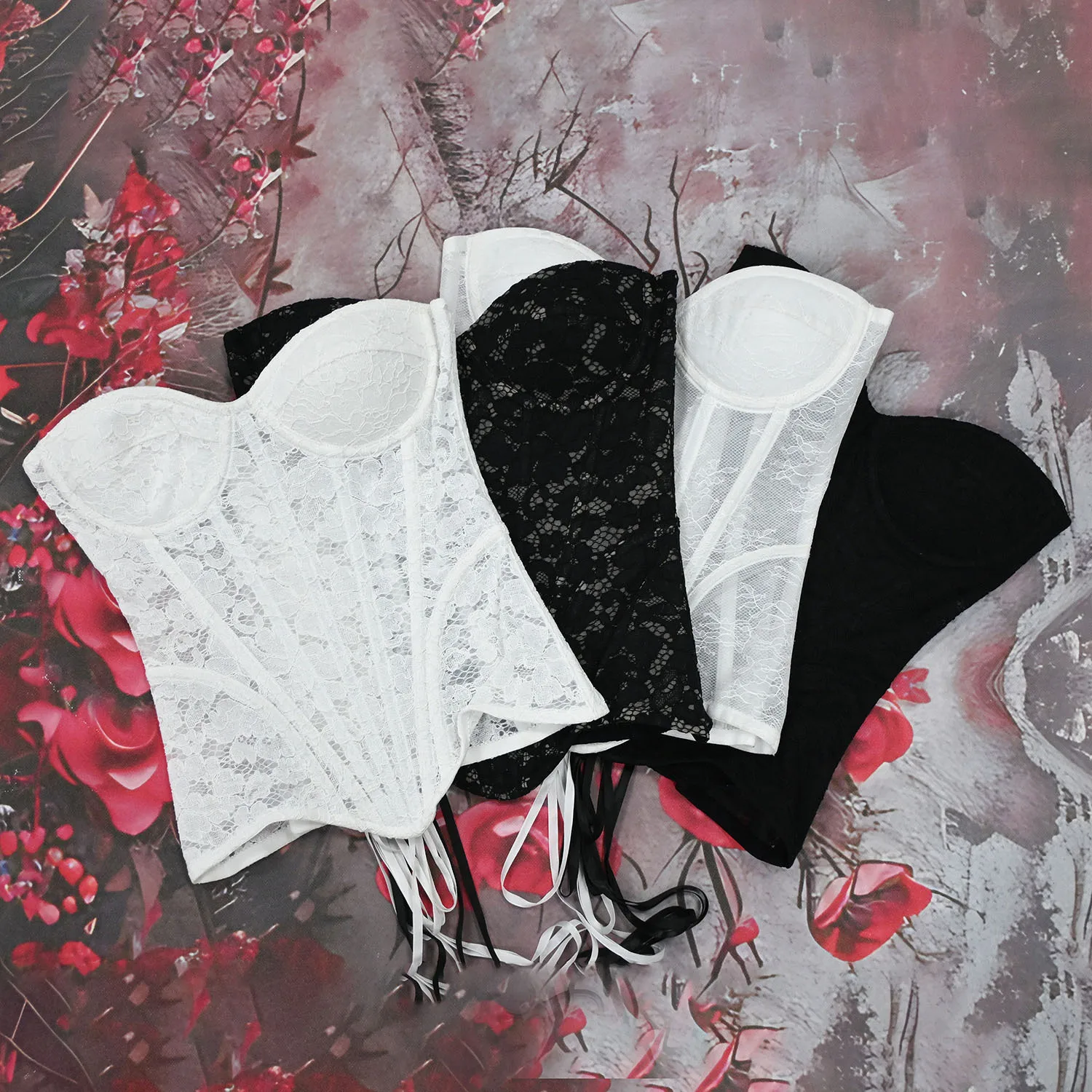 Sexy Sheer Bustier Party Tops Pure Color Women's Corset Padded Steel Bones V-Neck Flower Lace Overlay Overbust Corset Shapewear