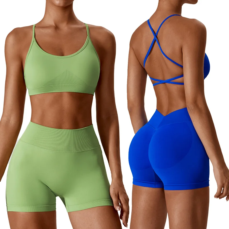 High Quality 2-Piece Workout Wholesale Seamless Gym Print Scrunch Butt Shorts Breathable Yoga Sportswear Sport Bra Set for Women