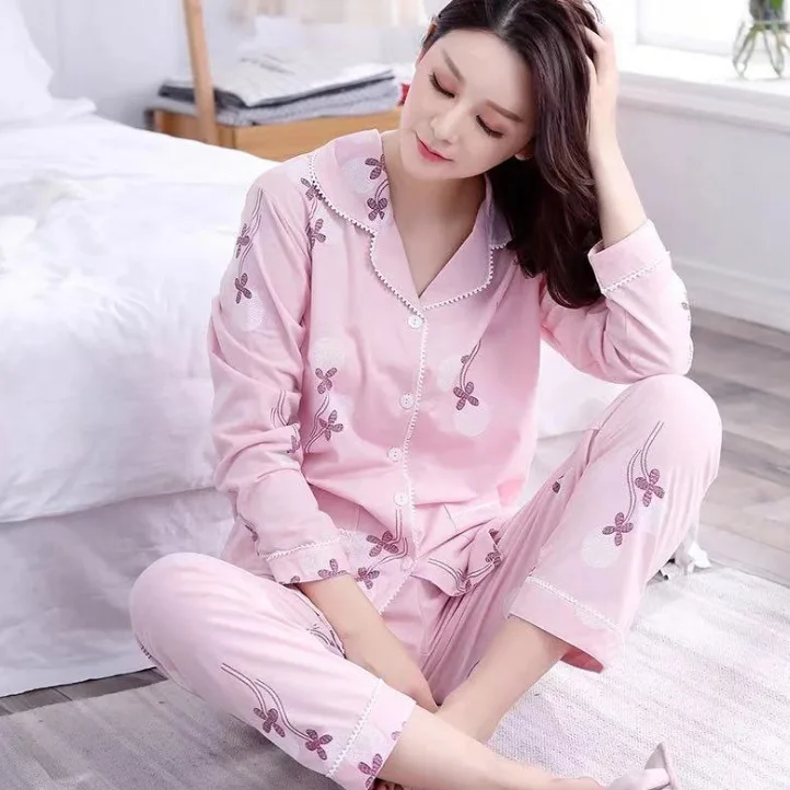 Women's V-neck Pajamas Double Sided Cotton Long Sleeve Pocketed Elastic Waist Breathable Home Wear Cotton Pajamas