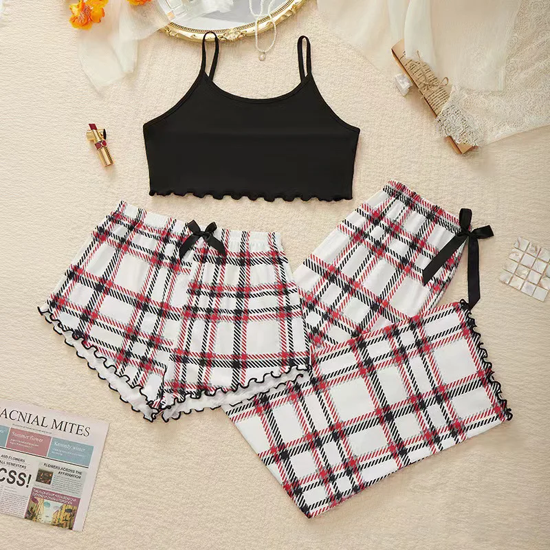 Women's Breathable Polyester Printed Three-Piece Night Pajamas Set Sleeveless Elastic Waist Summer Casual Full-Length Pants