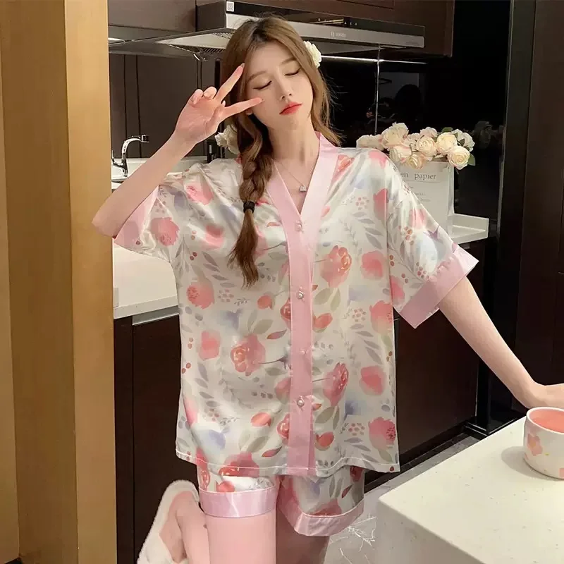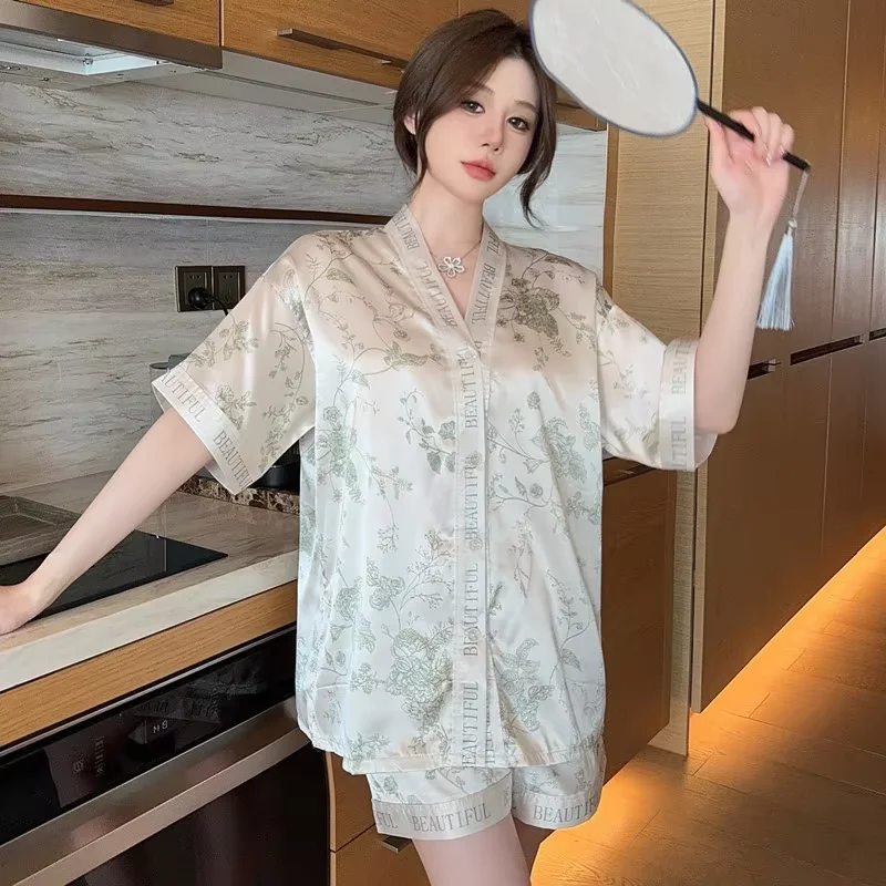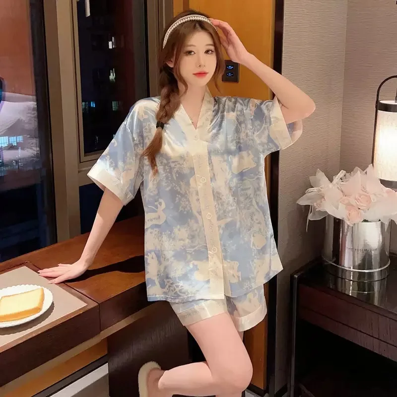 Lady's Summer Satin Silk Pajama Set Short Sleeved Nightgown Home Clothing for Women's Sleepwear Ladies' Home Clothing