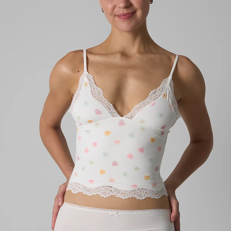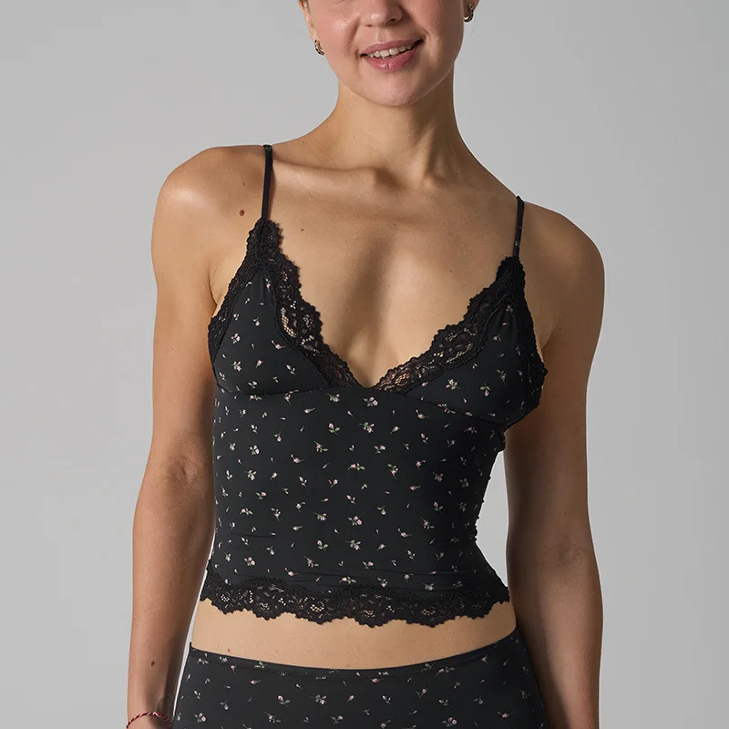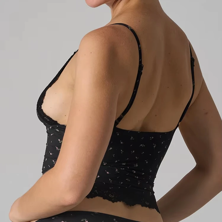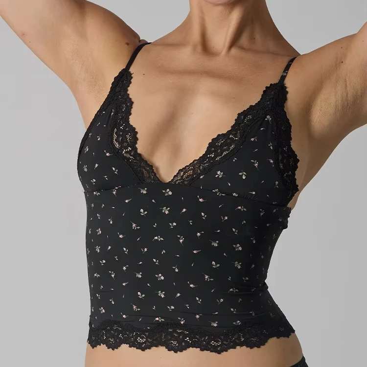 Stunning Chic Black Lace Trim Floral Print V-Neck Sexy Triangle Design Camisole for Women