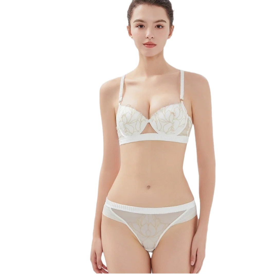 Women's Sexy Low-Rise Comfortable Bra Embroidery Floral Logo Pattern Thin Lace Back Breathable Underwire Boyshorts Underwear