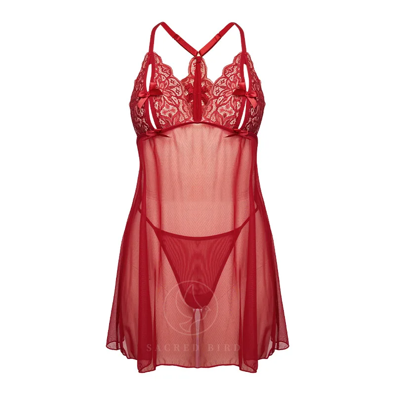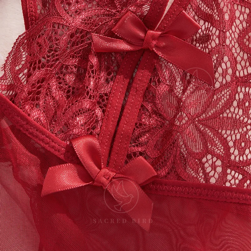 Women's Sexy T-shaped Lace Mesh Underwear Suit Bow Beautiful Back Nightdress ODM Supply Size XL Spandex Embroidery 3D Open Thin