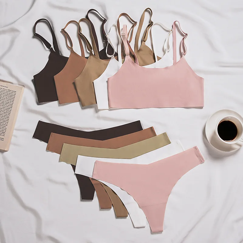 European American Women's Sexy Seamless Bra Suit Low-Rise Thongs Panties Breathable Camisole with No Steel Ring for Small Chest