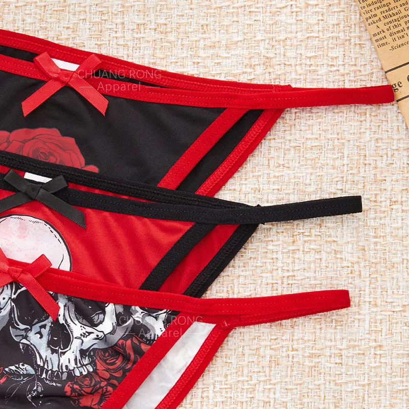 Women's Halloween Gothic Dark Sexy Hipster Underwear Anti-Bacterial Breathable Thin Strap Low-Rise Red Skull Rose Pattern