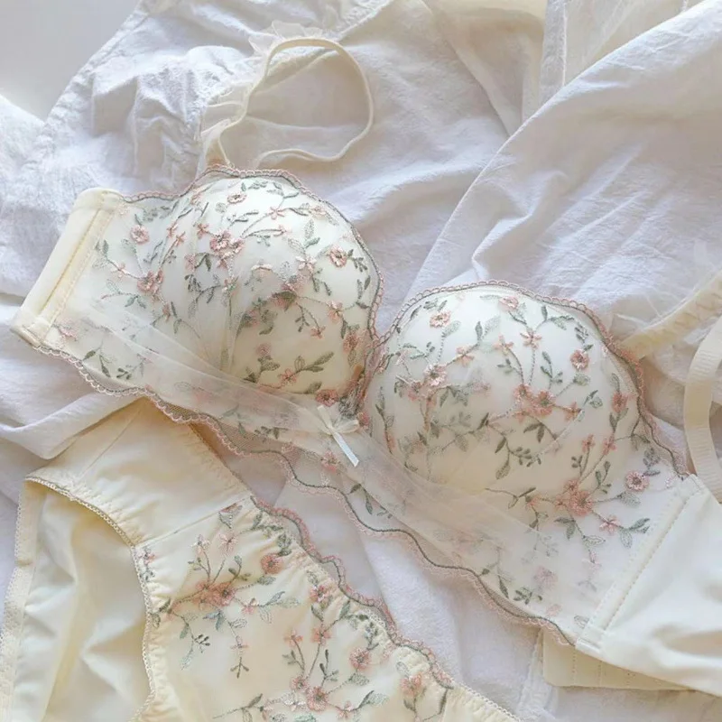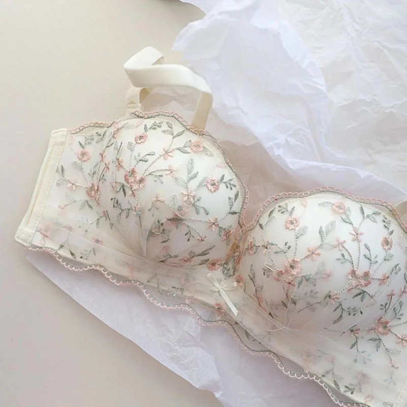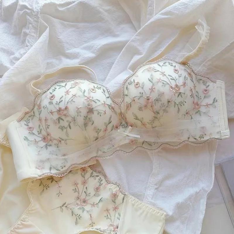 Sweet Milk Fu Sexy Lace Embroidered Floral Women's Small Chest Push-up Wire Free Spandex AA Cup Bra Set