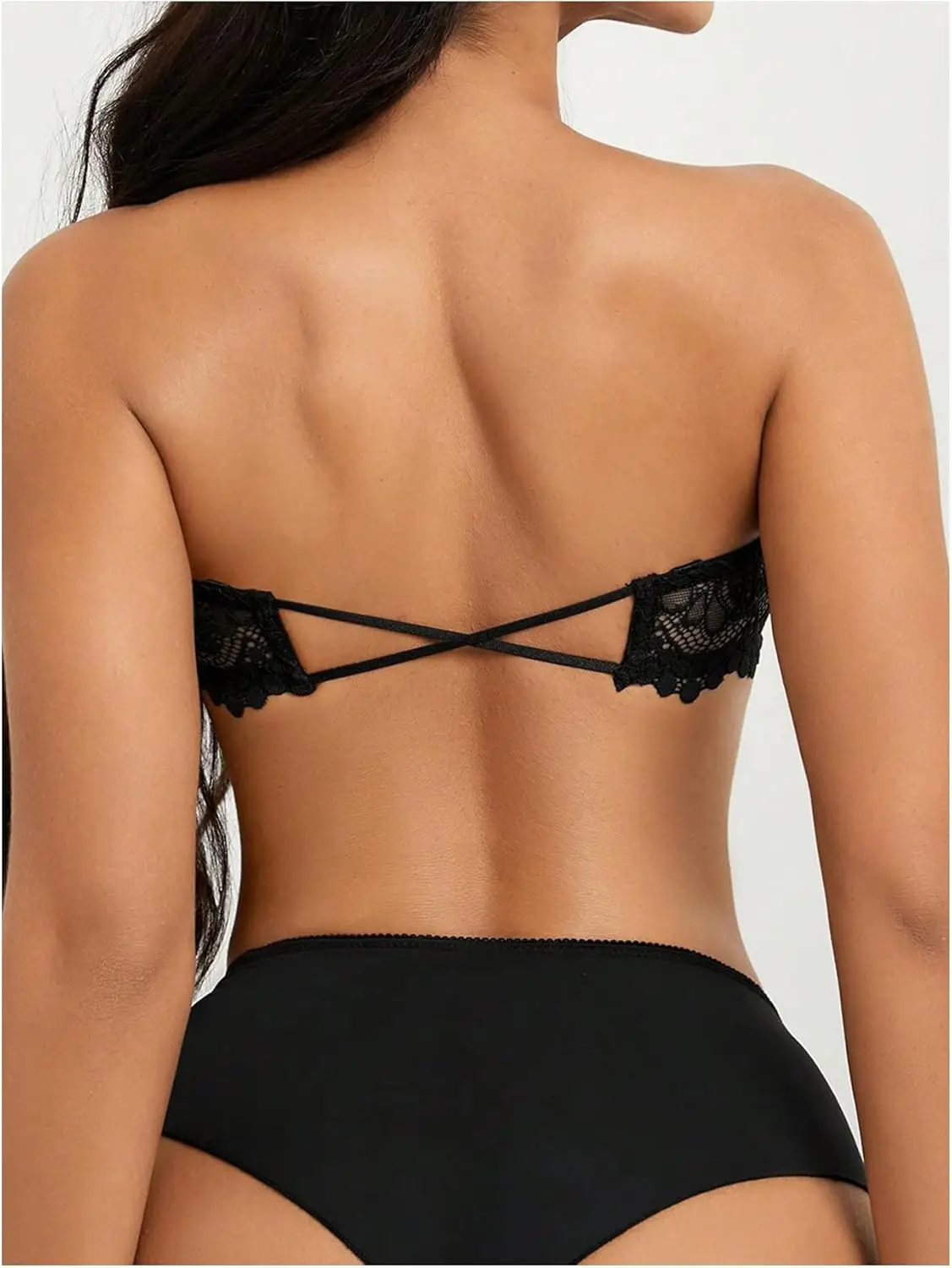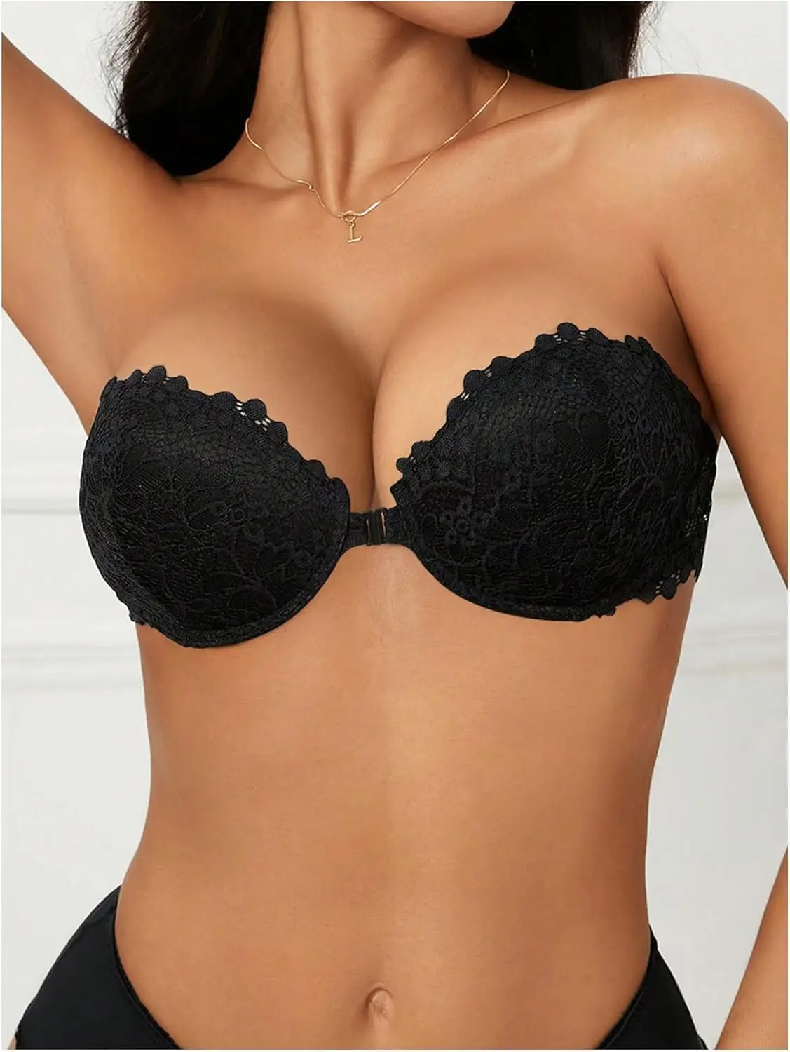 GORGLITTER Women's Gothic Strapless Push-Up Front Fastening Underwire High Support Scalloped Cross Back Lace Bra