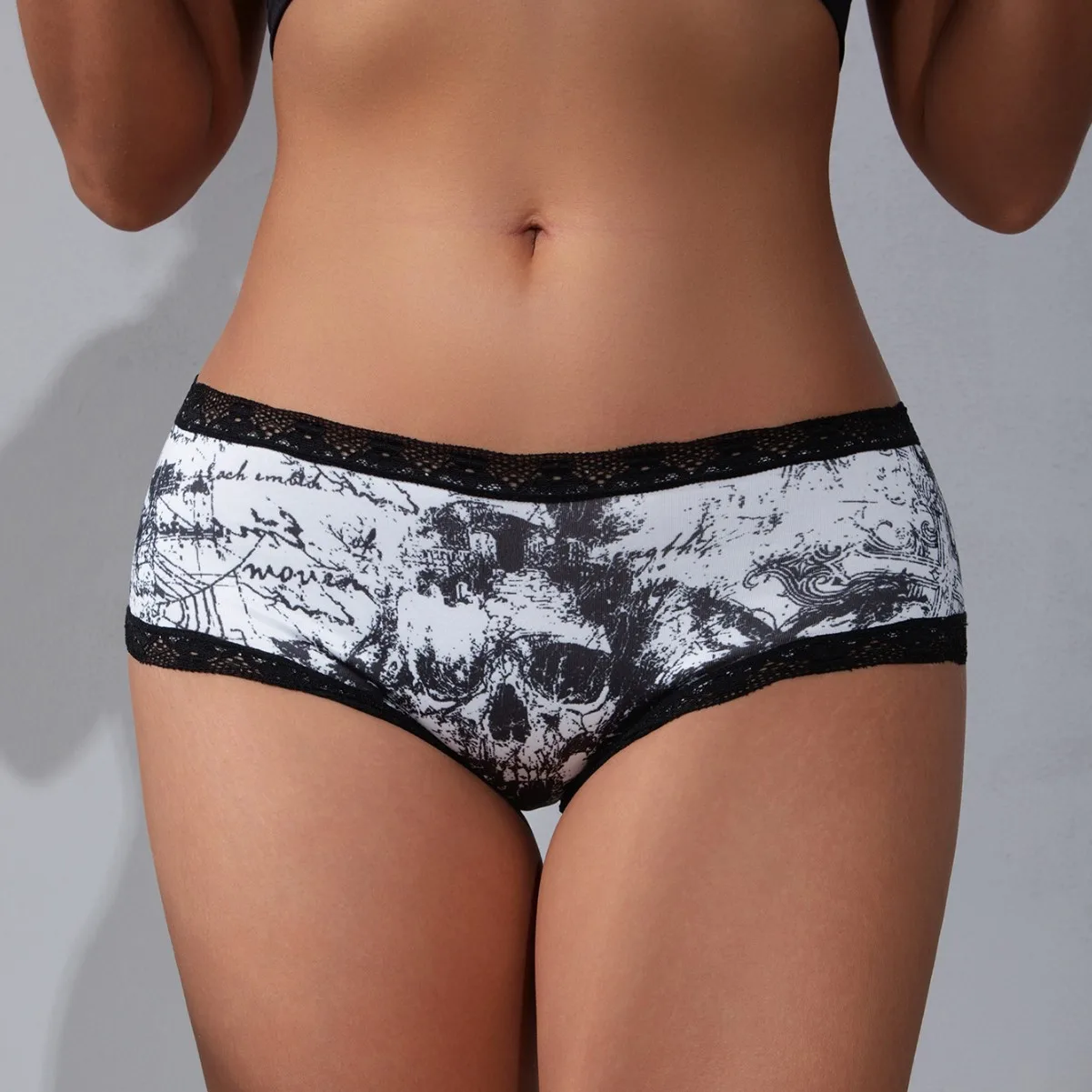 Cool Breathable Gothic Skull Star Print Tanga Thongs for Women Low-Rise Everyday Knitted Panties with Lace Decoration Waist Logo