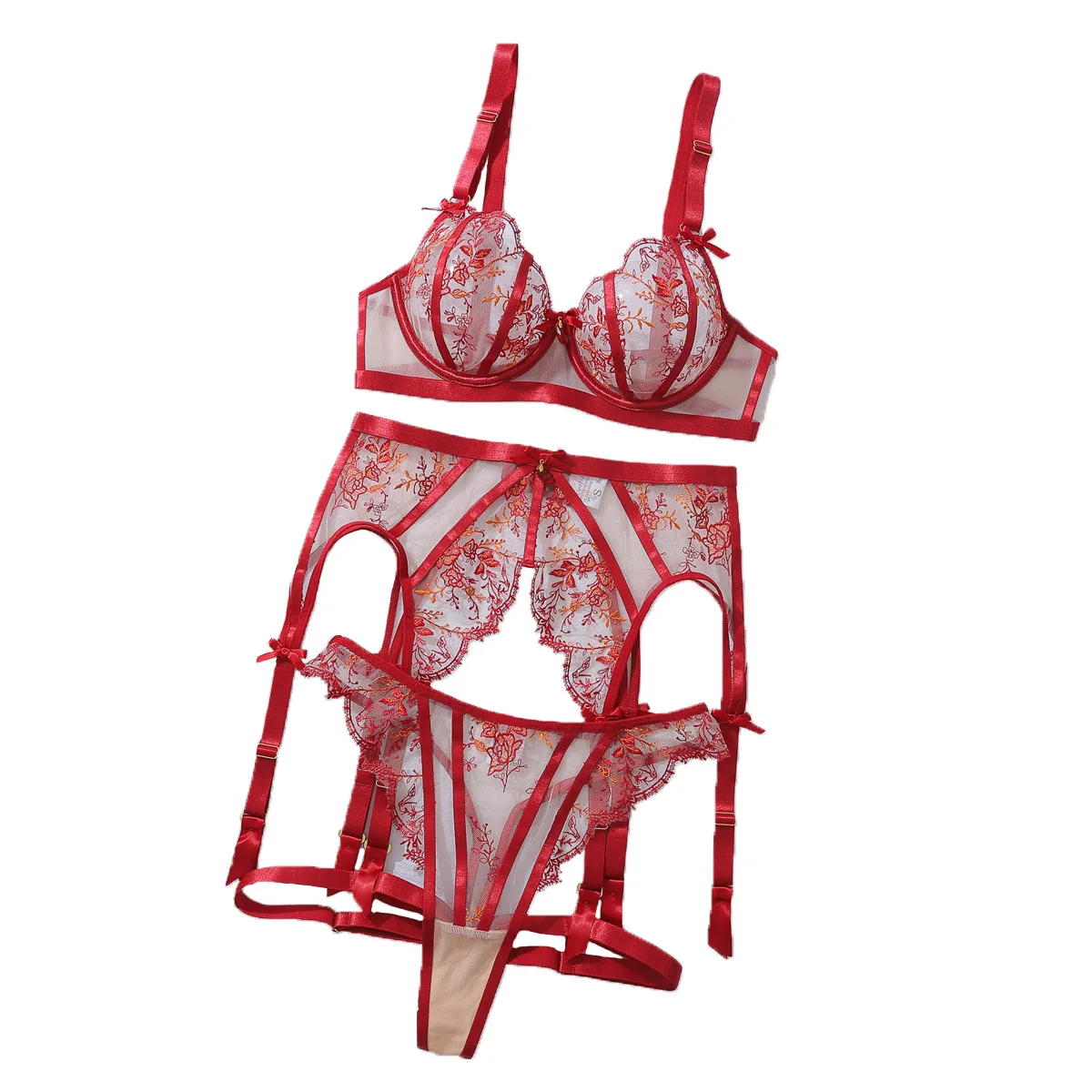 Women's Red Sexy Body Shaping Lingerie Set Spandex Lace Decoration Heavy Industry Flower Pattern