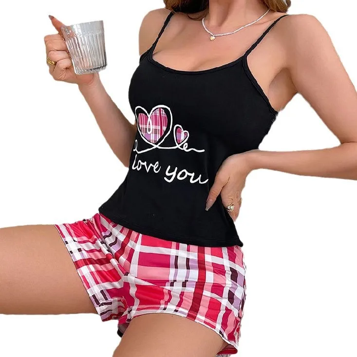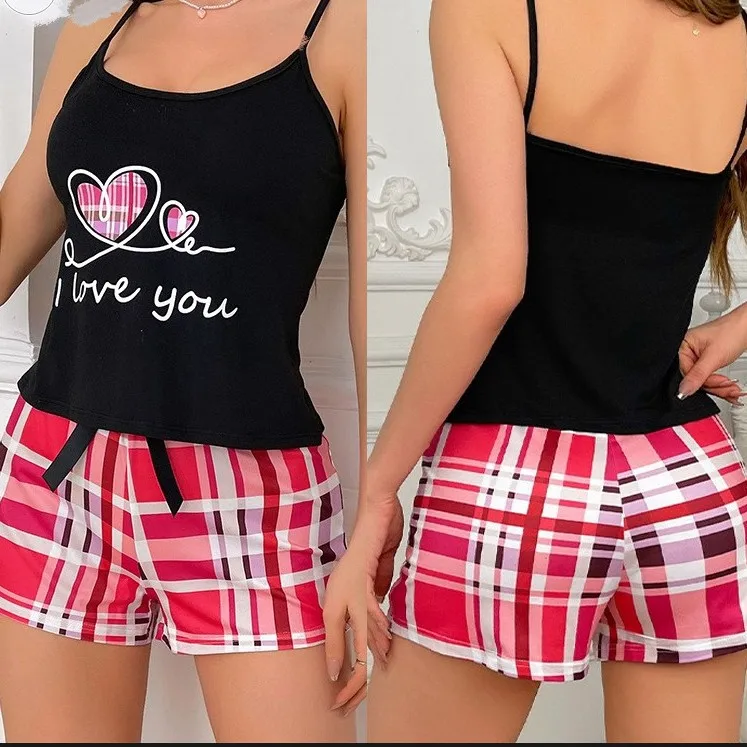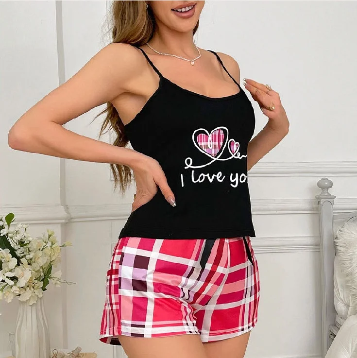 Women's Love Pattern Satin Pajamas Two-Piece Set Strapless Camisole with Front Logo Vest Shorts for Casual Home Use