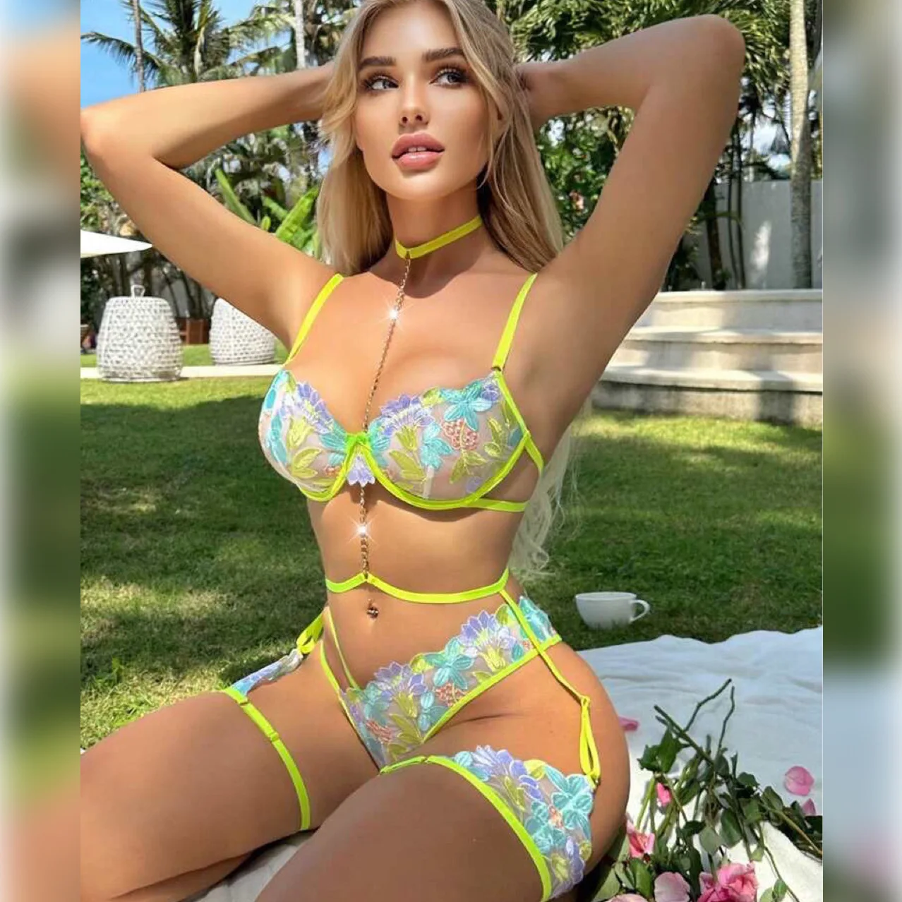 Sexy Dress Style Underwear Suit Light Firm Control Level Features Flower Leaf Embroidery Lace Metal Chain Stitching Fashionable