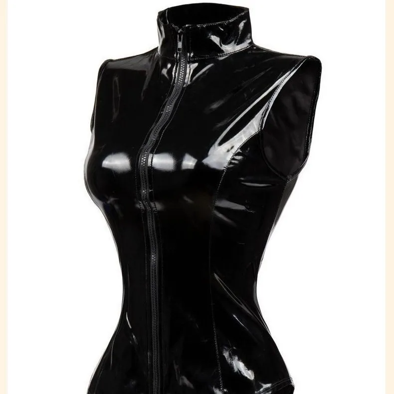 Size Plus Black Latex Triangle Catsuit with Bright Patent Leather Slim-Fit Sexy Club Uniform Inflatable Feature