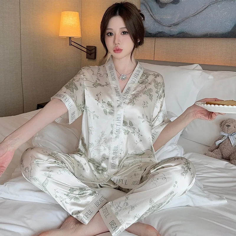 New Luxury Summer Silk Pajamas for Women Loose Fit Large Size Ice Silk Thin Short-Sleeved Pants Suit Geometric Animal Patterns