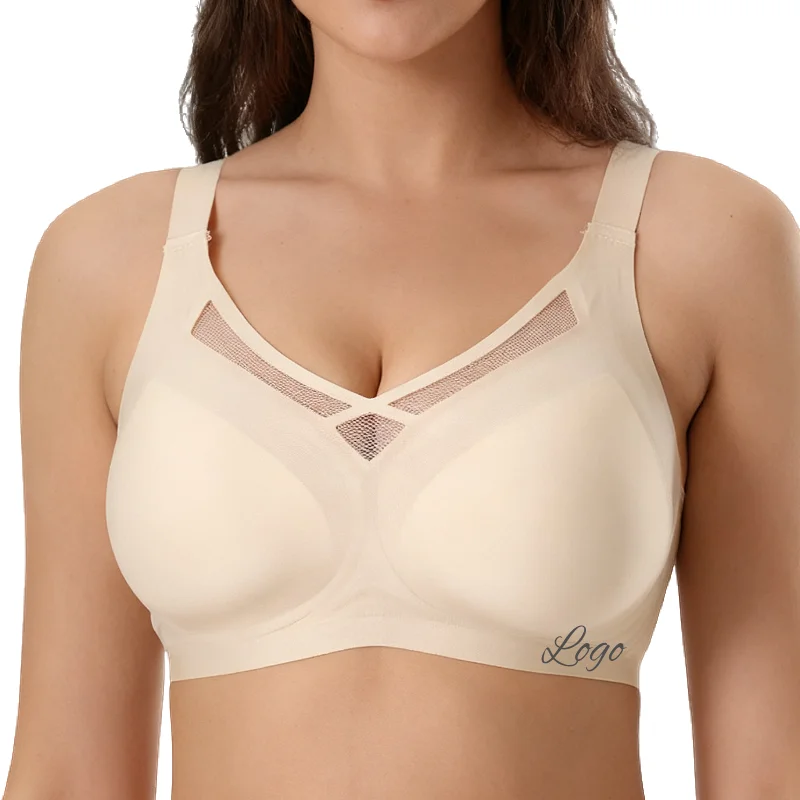Customized Logo Seamless Plus Size Wireless Bra for Women Push up Bralettes Ladies V Neck Full Cup Padded Scalloped Bras