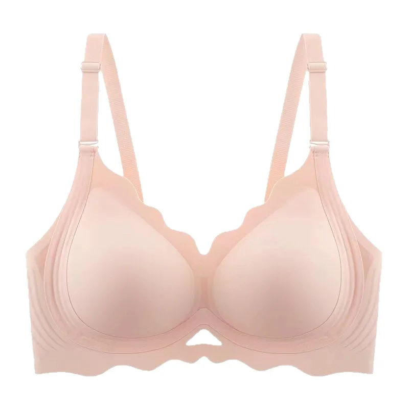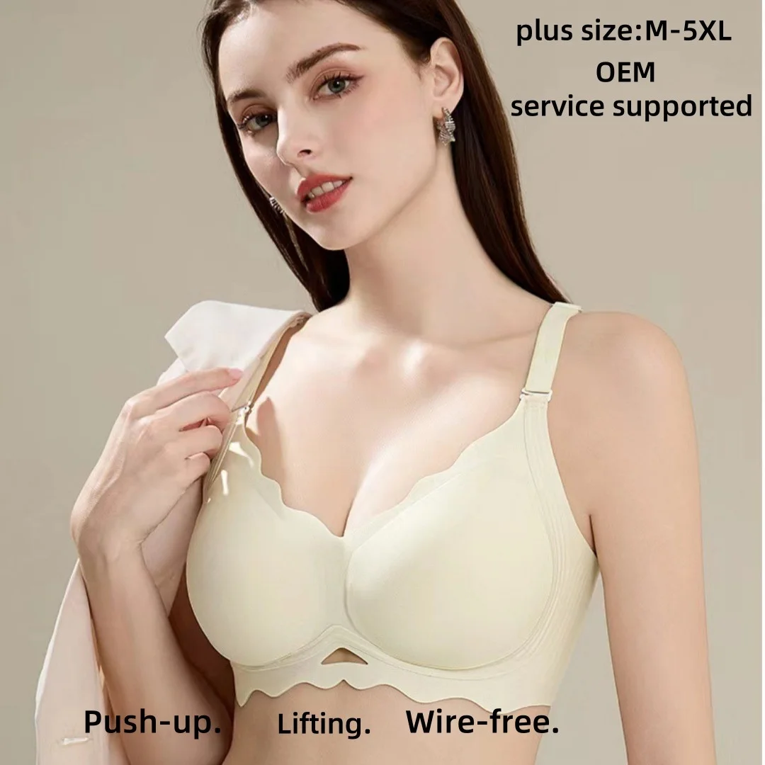 Customized Logo Seamless Plus Size Wireless Bra for Women Push up Bralettes Ladies V Neck Full Cup Padded Scalloped Bras
