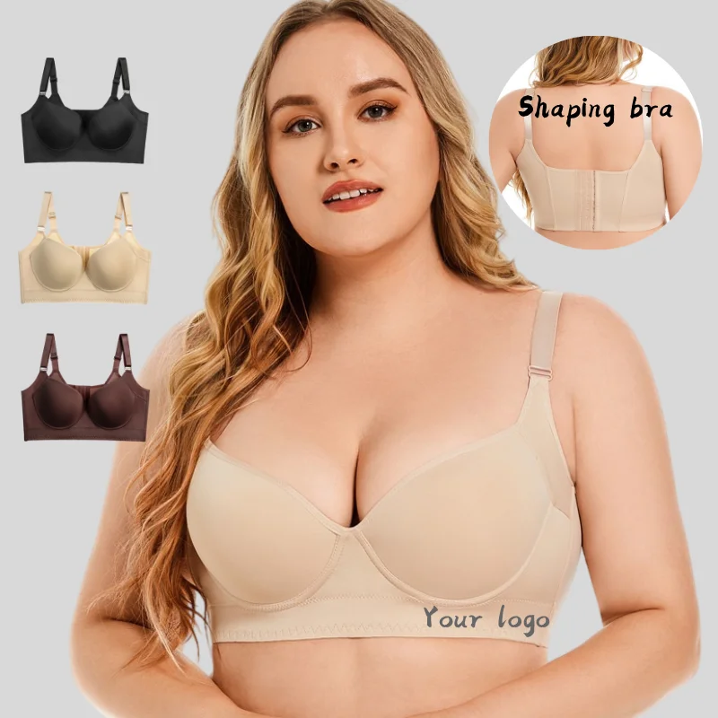 Customized Logo Seamless Plus Size Wireless Bra for Women Push up Bralettes Ladies V Neck Full Cup Padded Scalloped Bras