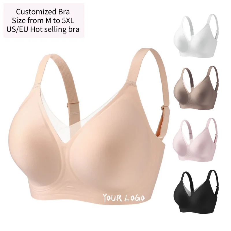 Customized Logo Seamless Plus Size Wireless Bra for Women Push up Bralettes Ladies V Neck Full Cup Padded Scalloped Bras