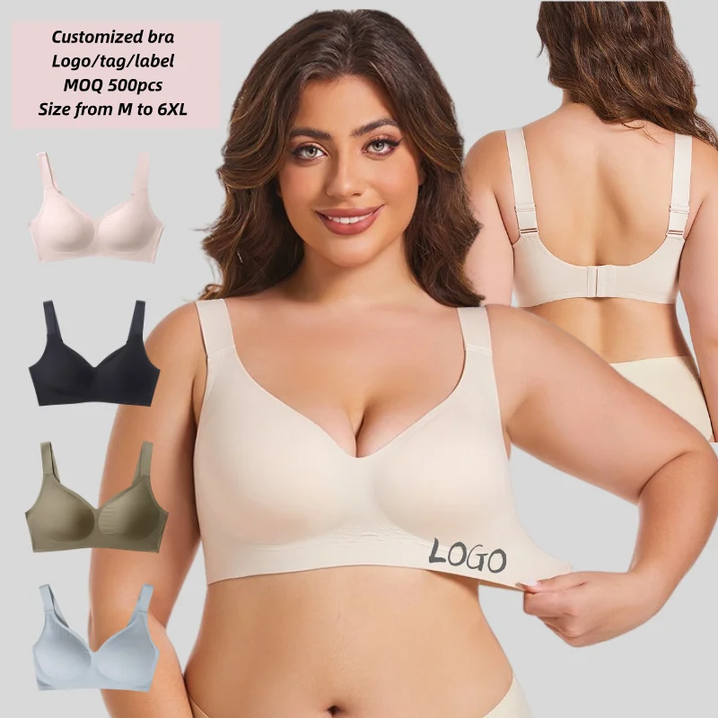 Customized Logo Seamless Plus Size Wireless Bra for Women Push up Bralettes Ladies V Neck Full Cup Padded Scalloped Bras