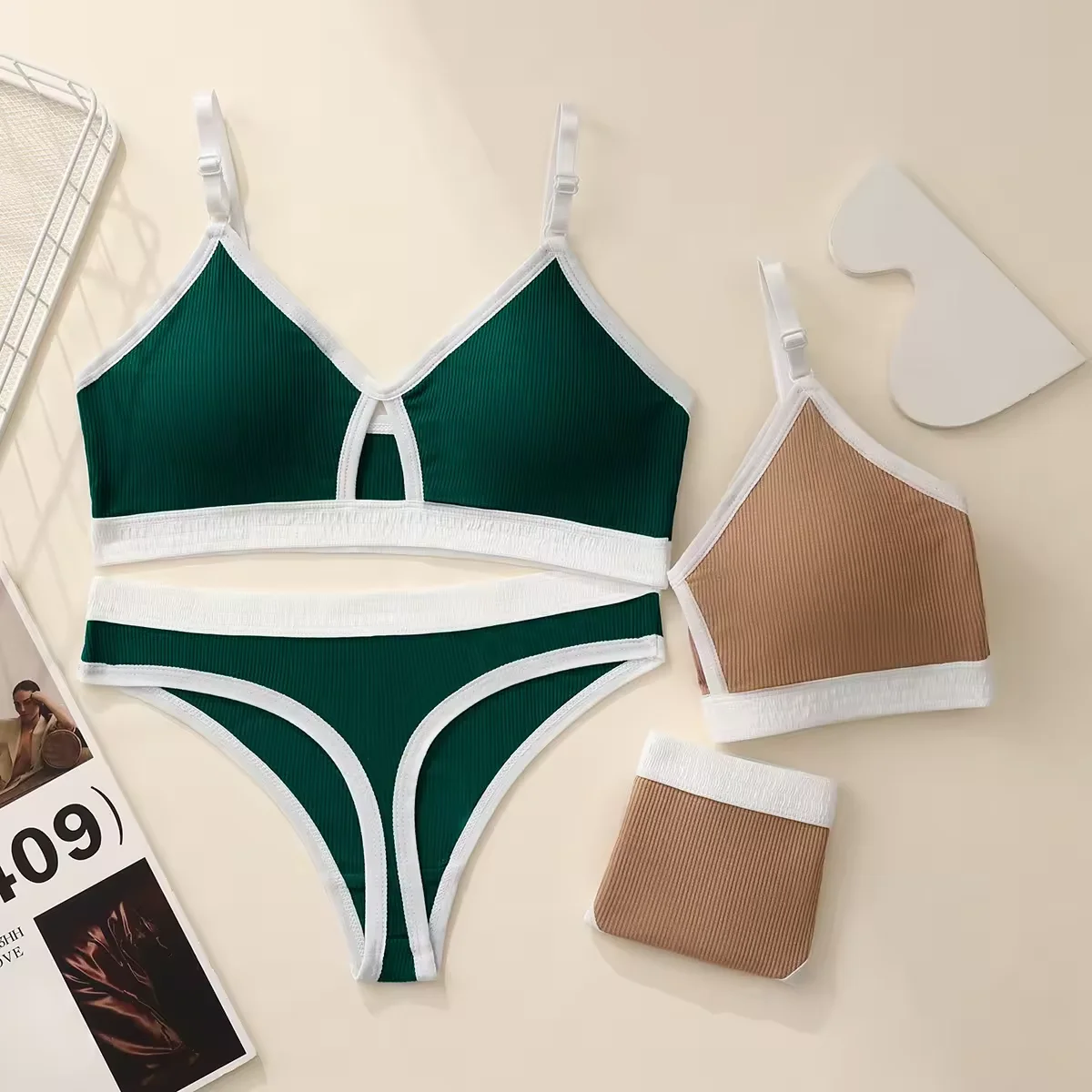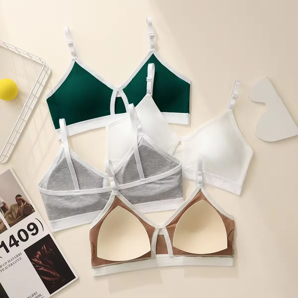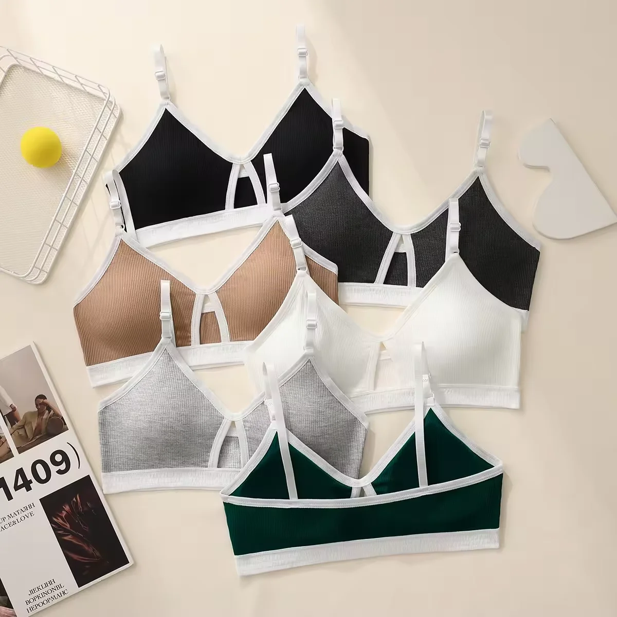 Factory wholesale Cotton Thin Contrast Color V-neck Beautiful Back Sports Bra Suit Disassembly Cup Bra Sexy Comfortable Thong